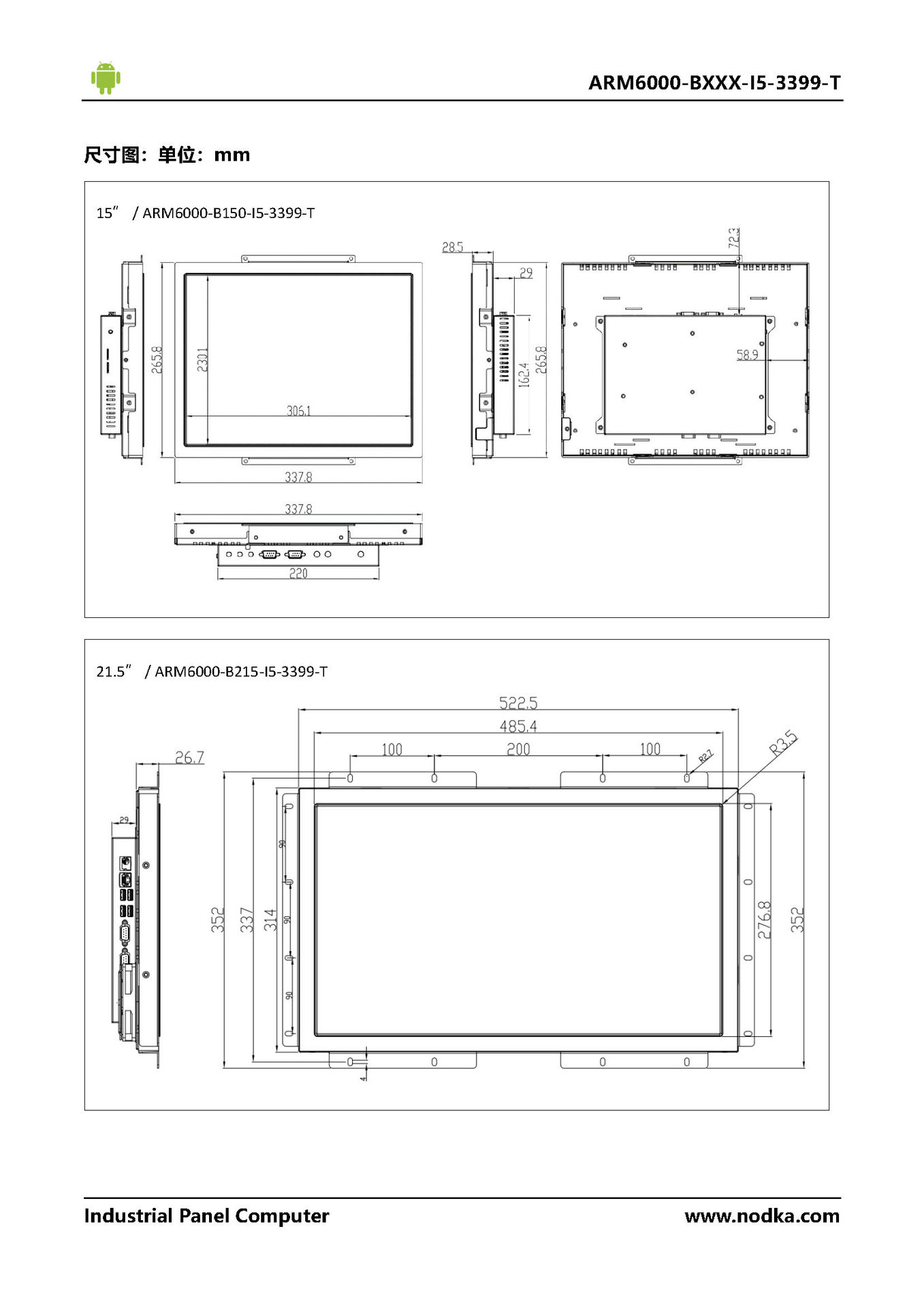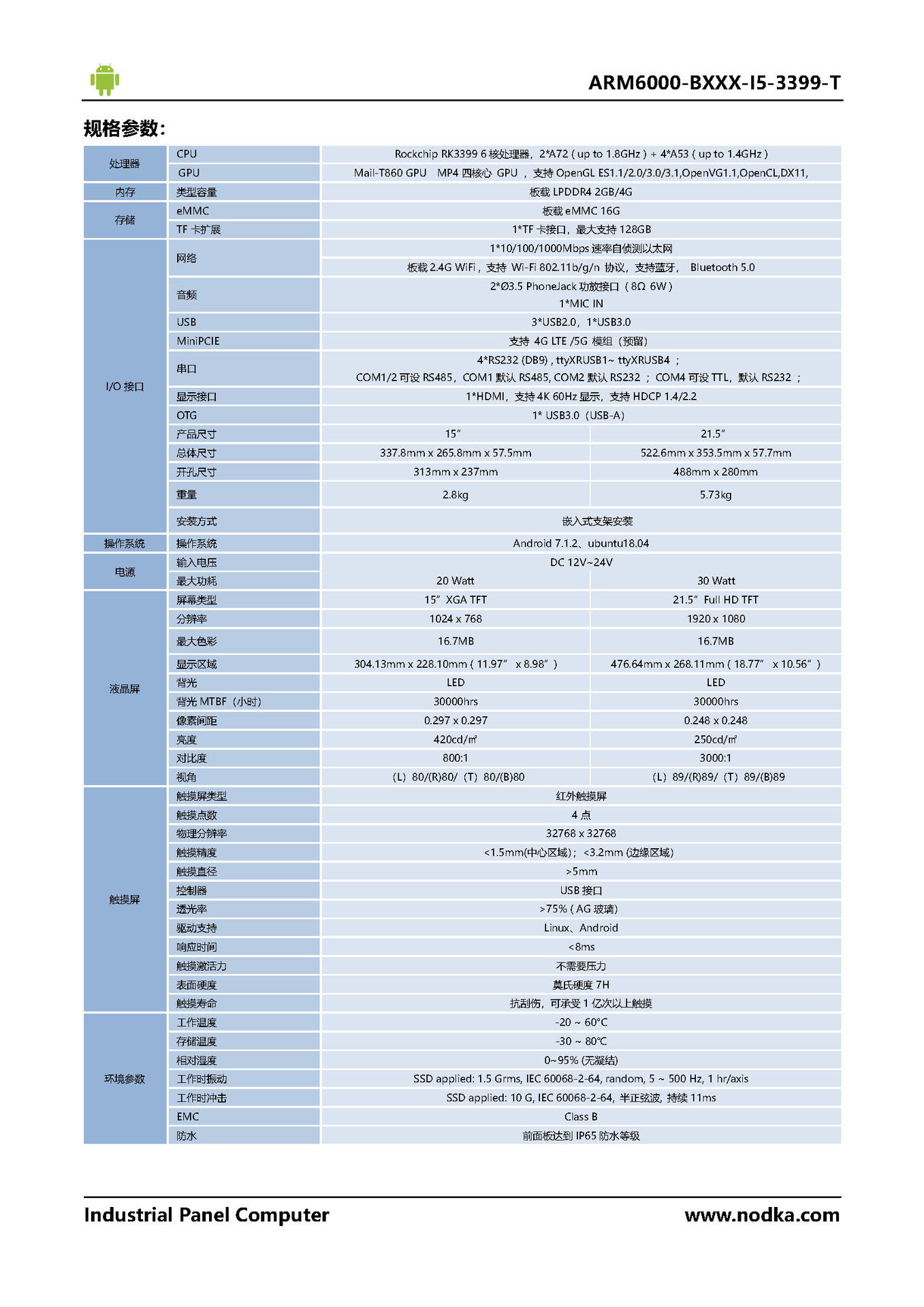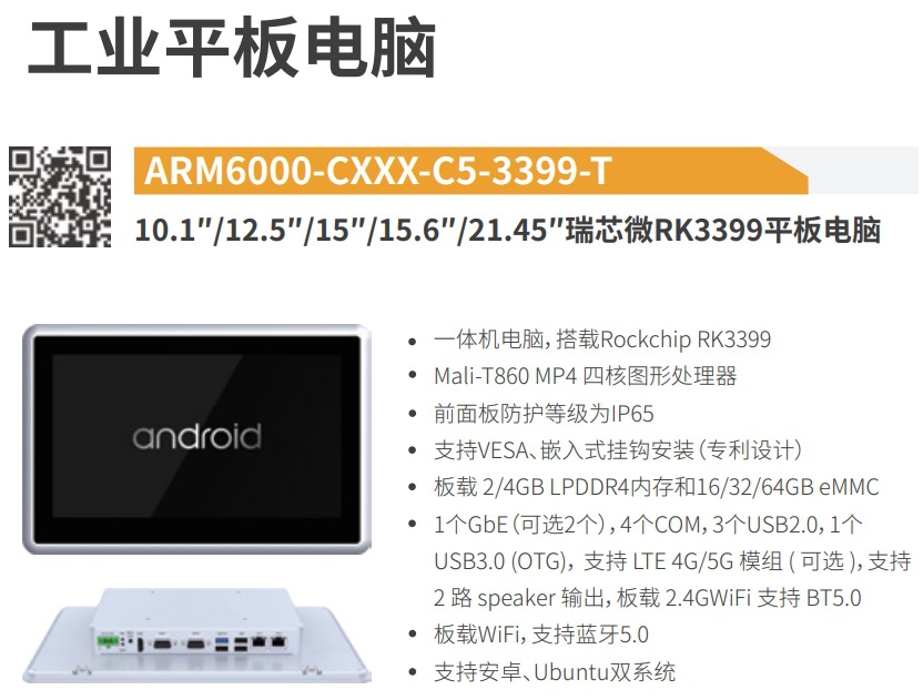 ARM6000-BXXX-I5-3399-T 采用Rockchip RK3399 6核处理器,2*A72 ( up to 1.8GHz ) ,4*A53 ( up to 1.4GHz ) ;拥有超强的通用计算能力,可满足人脸识别等应用 ;千兆以太网、支持4G、5G、WiFi网络 , 4路串口,4路USB,接口丰富 ,满足智能柜外设需要 ;采用红外触摸屏,防水、防尘、抗光能力强,散热良好,可适应室内、室外各种恶劣环境,无间断稳定运行 。针对安行进行大量本地化优化,可满足智能柜无人值守,远程维护诉求 。