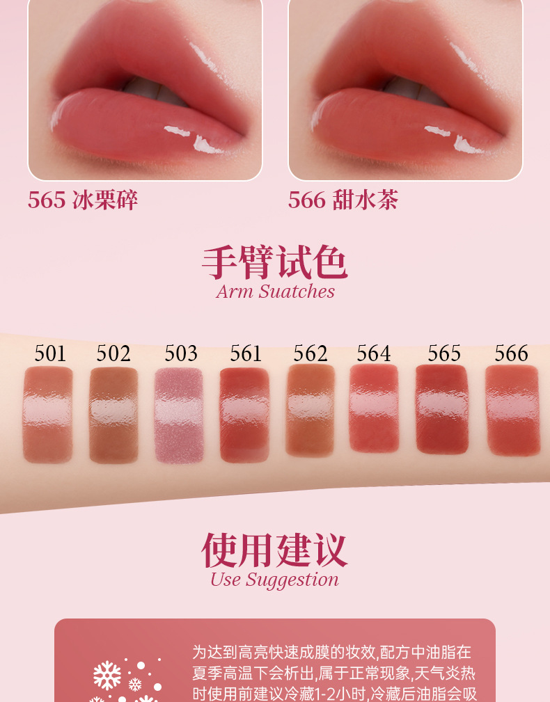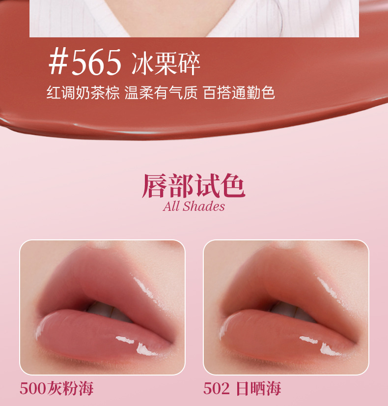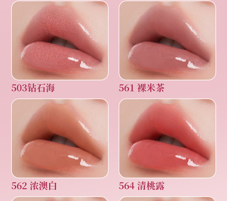 Твердый блеск для губ: 500 серый морской порошок; Твердый блеск для губ: 501 Rose Pool; Твердый губный канал: 502 солнечные ванны; Твердый блеск для губ: 503 Diamond Sea; Блеск для губ в фиолетовой тюбике: 561 чай с голым рисом; Блеск для губ в фиолетовой тюбике: 562, толстый, австралийский белый.; Блеск для губ в тюбике с глубоким порошком: 564 прозрачная персиковая роса; Светло-розовый тюбик-блеск для губ: 565 колотый ледяной каштан.; Твердый блеск для губ: 567 бриллиантово-коричневый.; Твердый блеск для губ: 568, оттенок «водяной блеск» коричневый; Твердый блеск для губ: винтажный коричневый 1990-х годов.