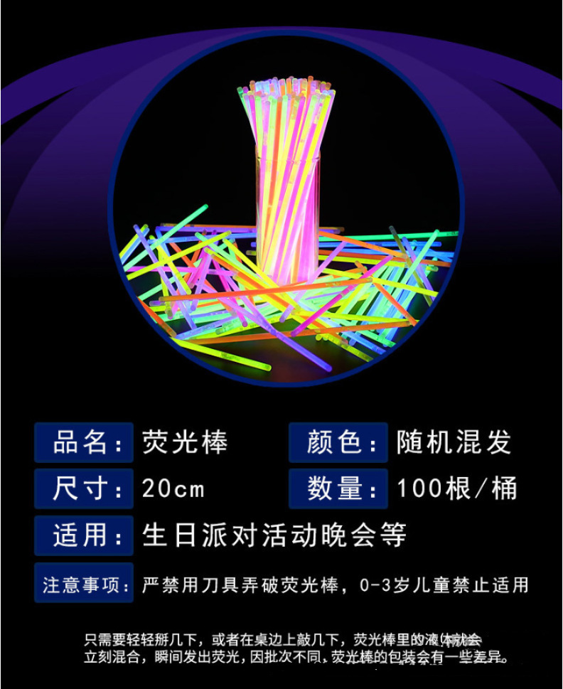 荧光棒100支一桶,不到100的倍数下单不发货的哈,即使发货也没有转接头配送。