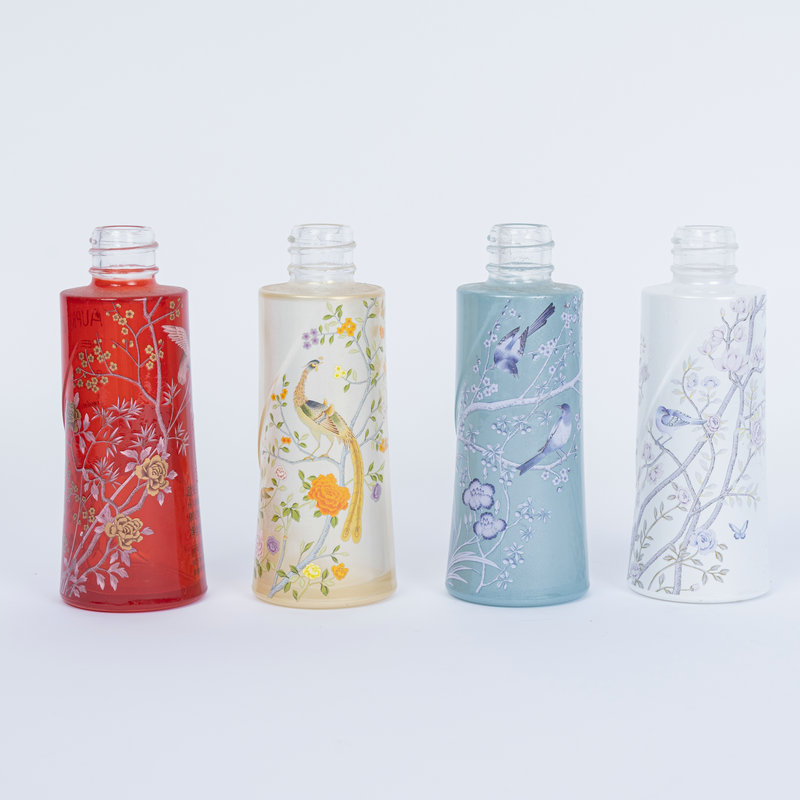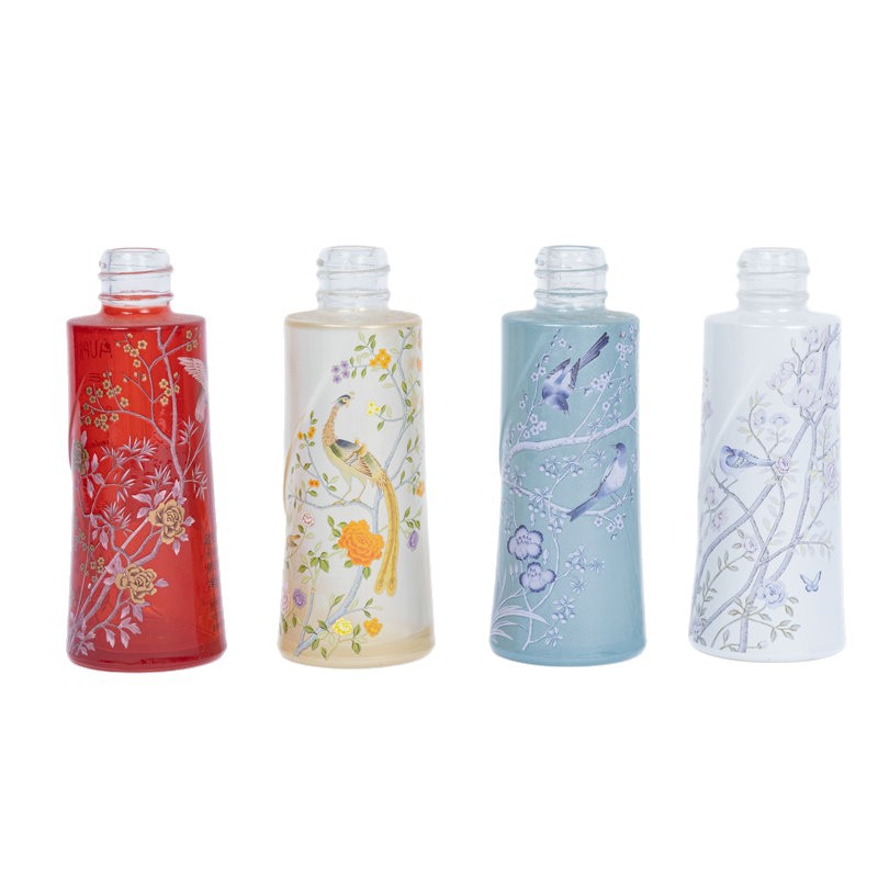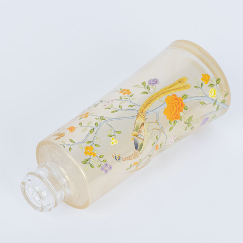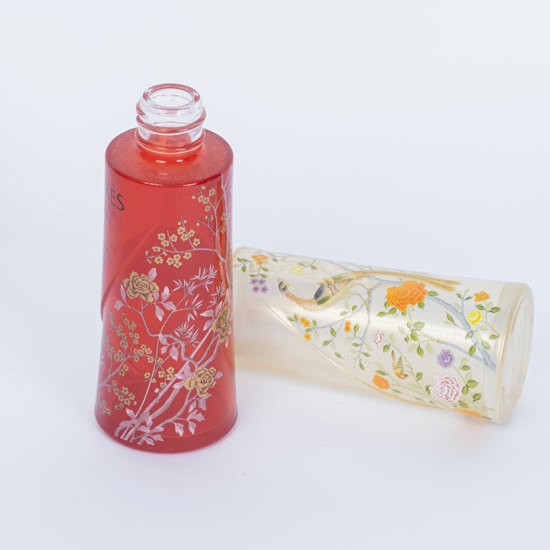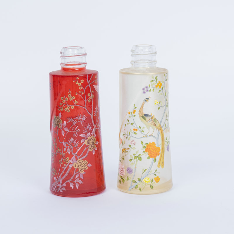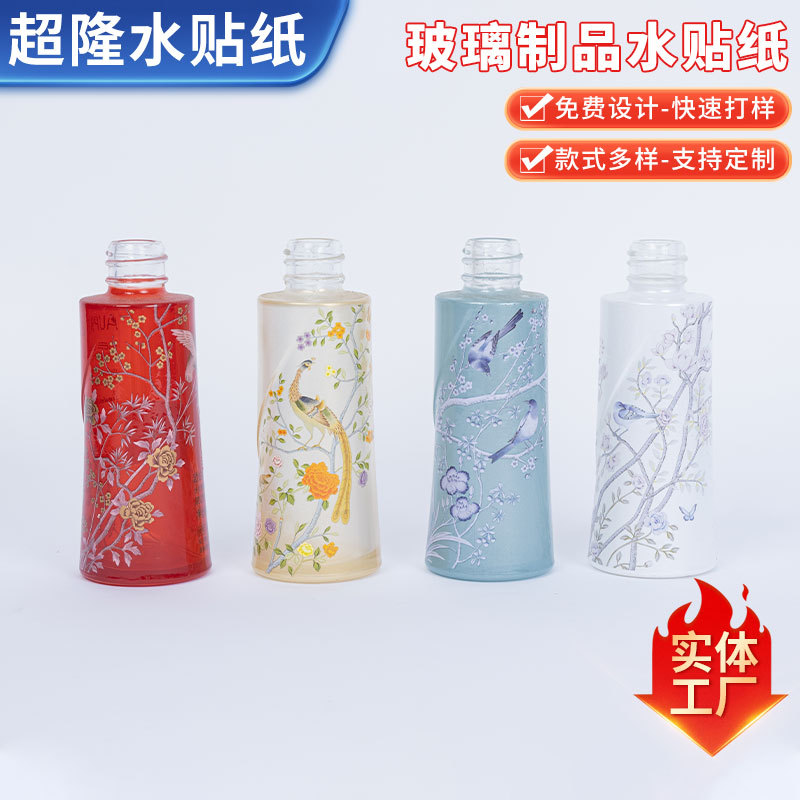 Обработка стеклянных бутылок для воды наклейками, горячее тиснение на косметических флаконах цветочным рисунком, этикетки с блестками, производитель цветочных наклеек для стекла