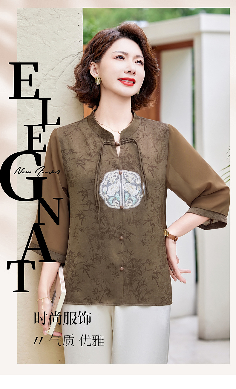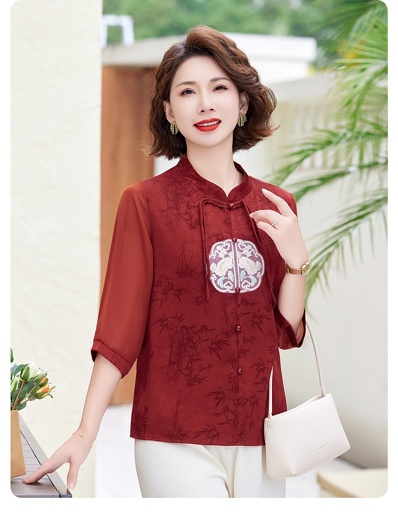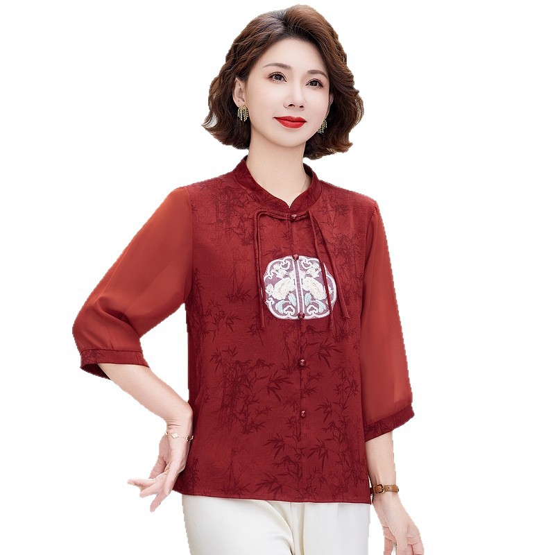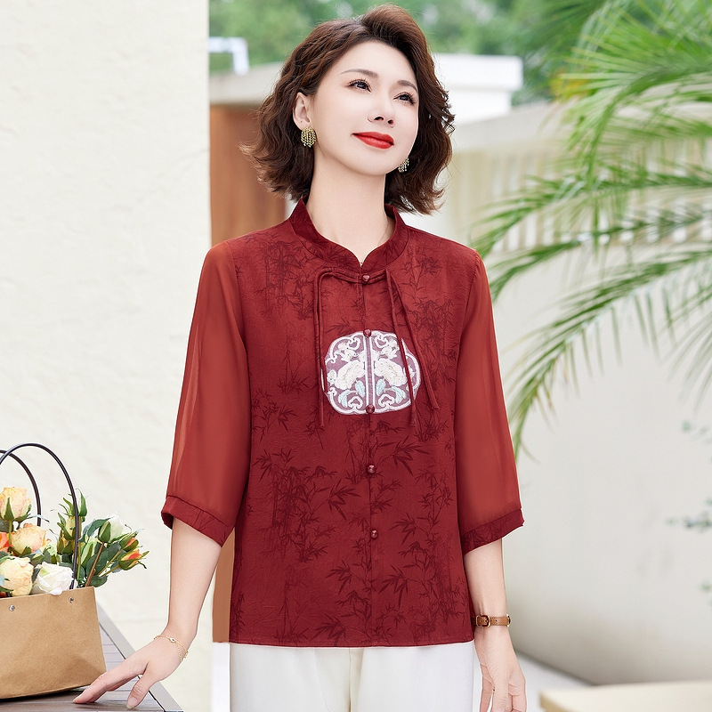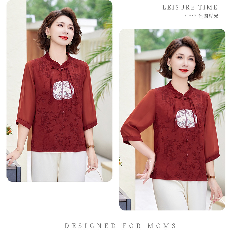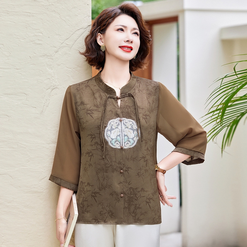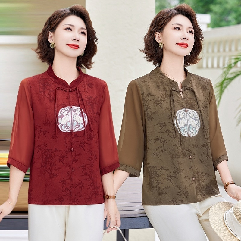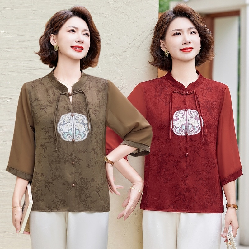 Летняя футболка для мам, рубашка с коротким рукавом в китайском стиле, новая модель 2025 года, модный и омолаживающий топ для женщин среднего и пожилого возраста.