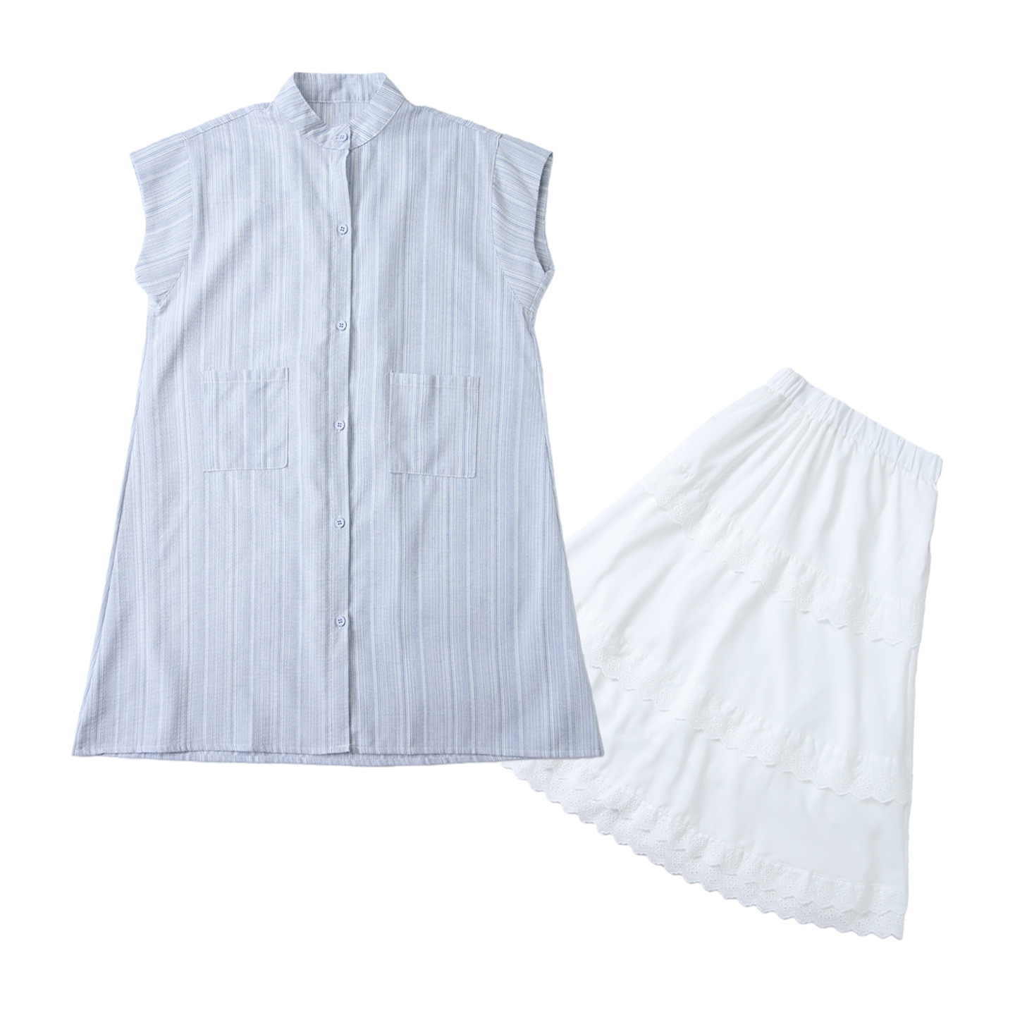 Полосы (длинная рубашка); полоски (рубашка); белый (юбка); белый (брюки); Полоски (рубашка + юбка); Полосатый комплект (рубашка + брюки)