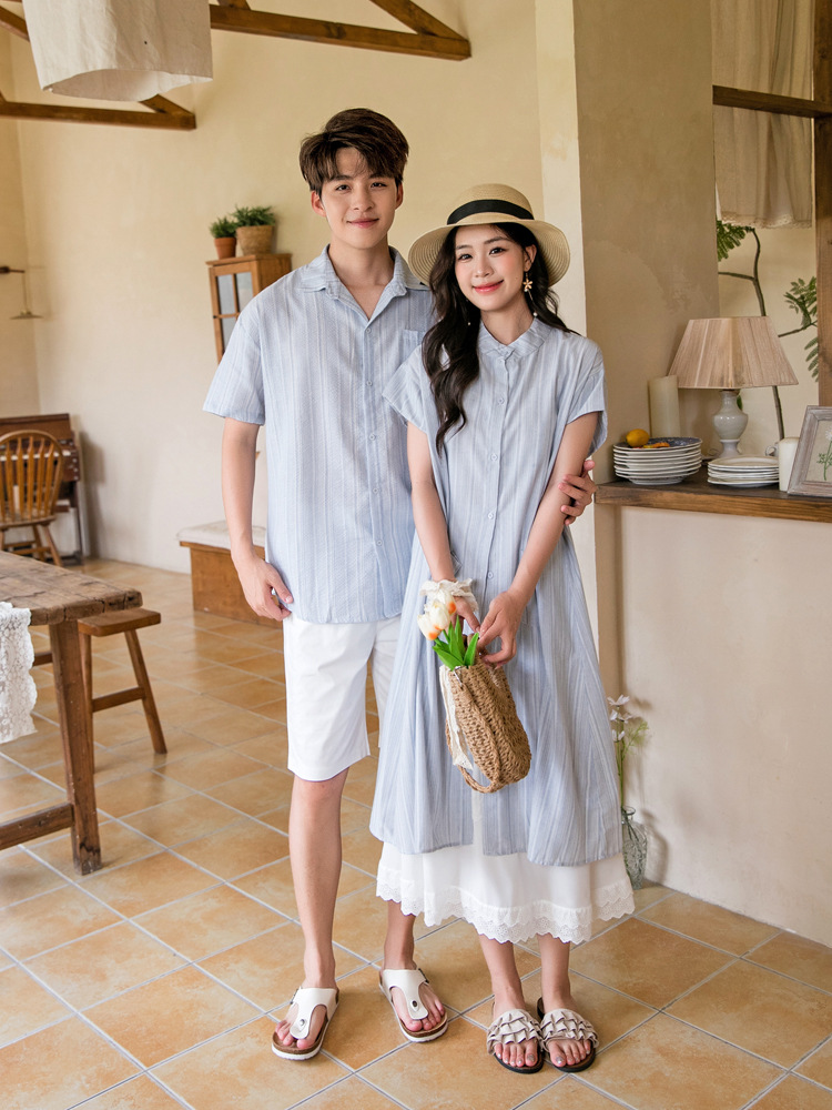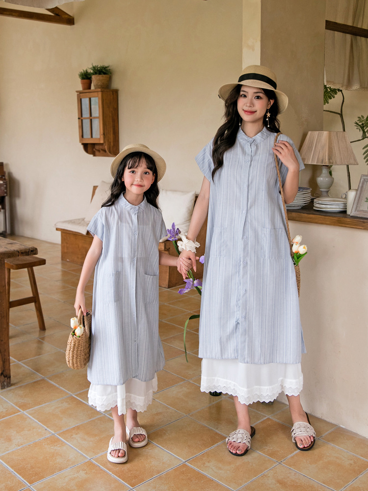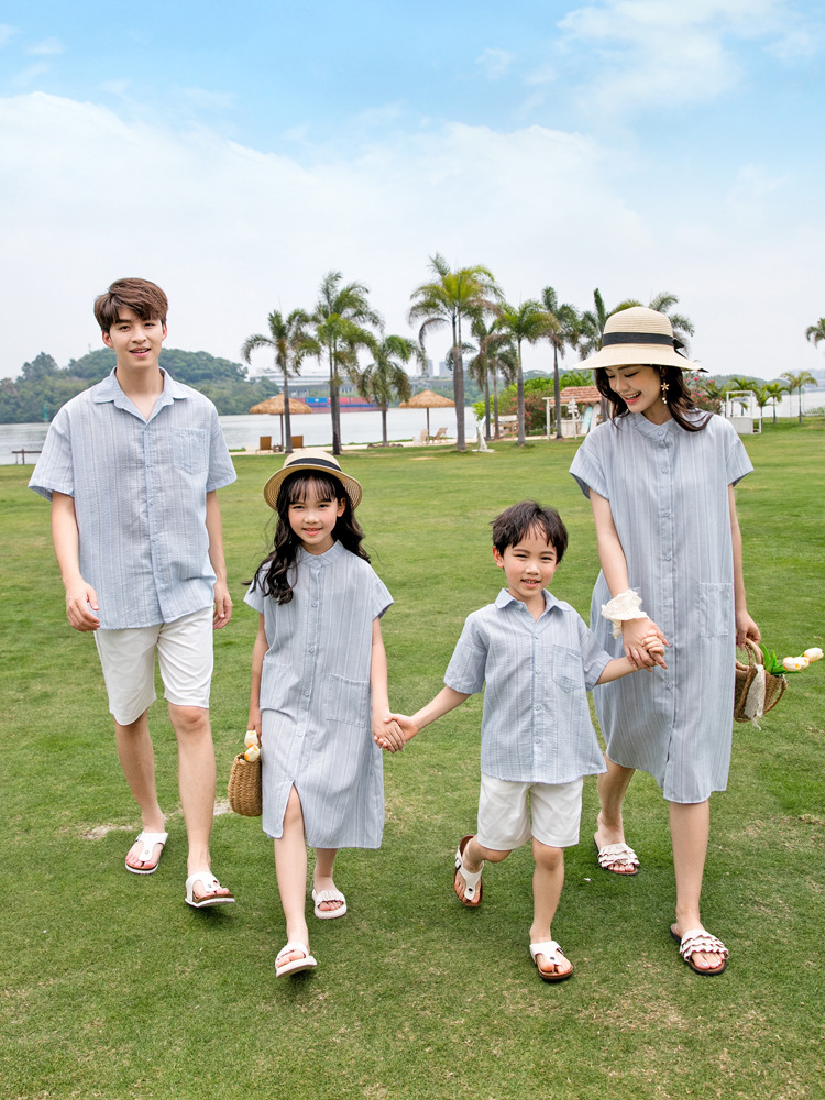 Новая сетка Red High Ding пара летняя полоска с короткими рукавами рубашка женская одежда корейская одежда для родителей и детей свободная повседневная одежда