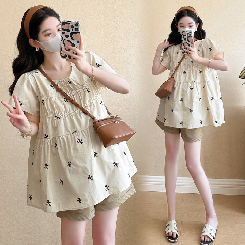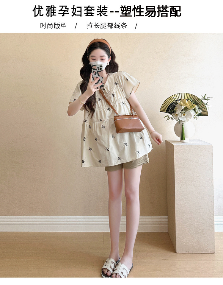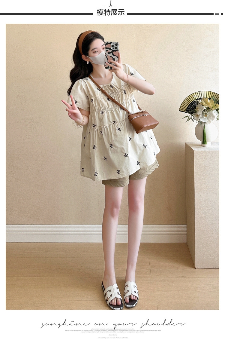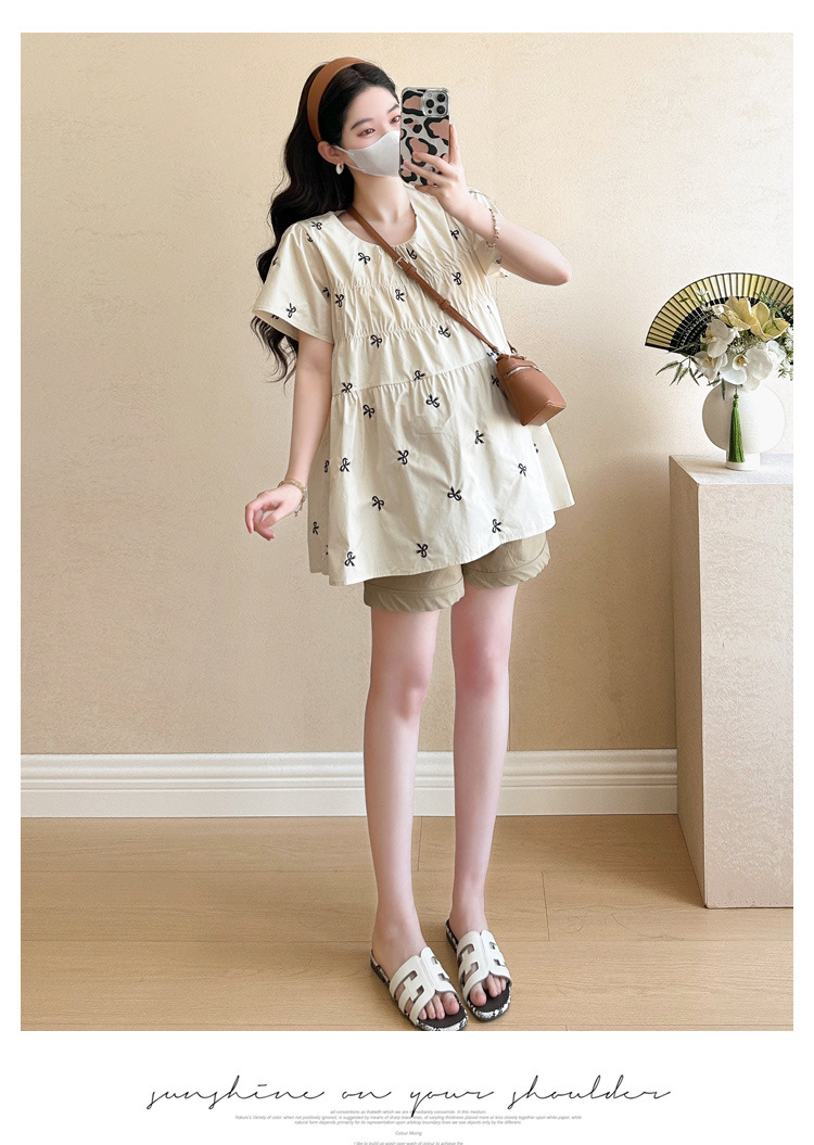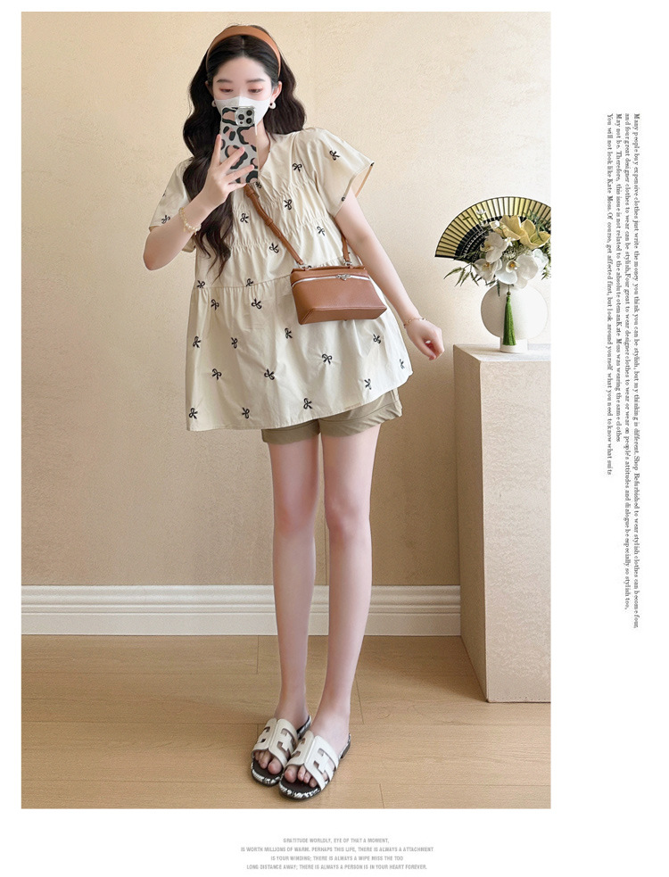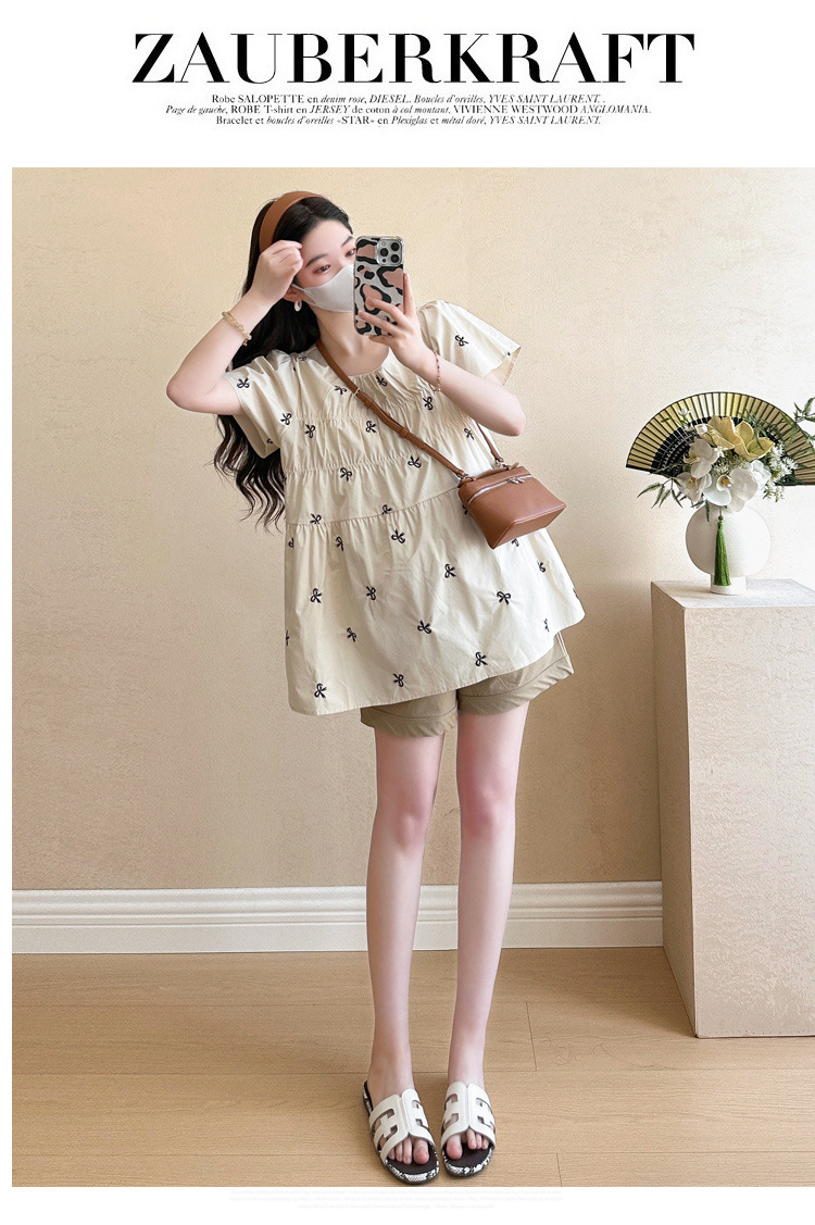 Фактический снимок нового корейского топа для беременных 2025 года с летающими рукавами и бантом, вышитый, уменьшающий возраст, топ + шорты для поддержки живота