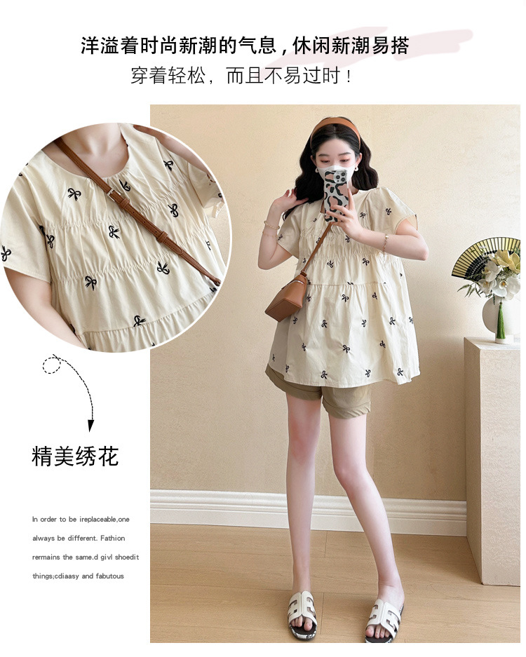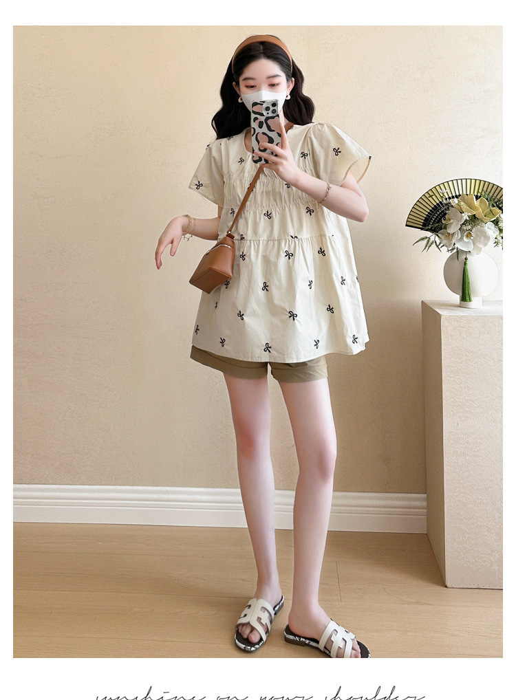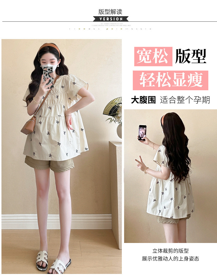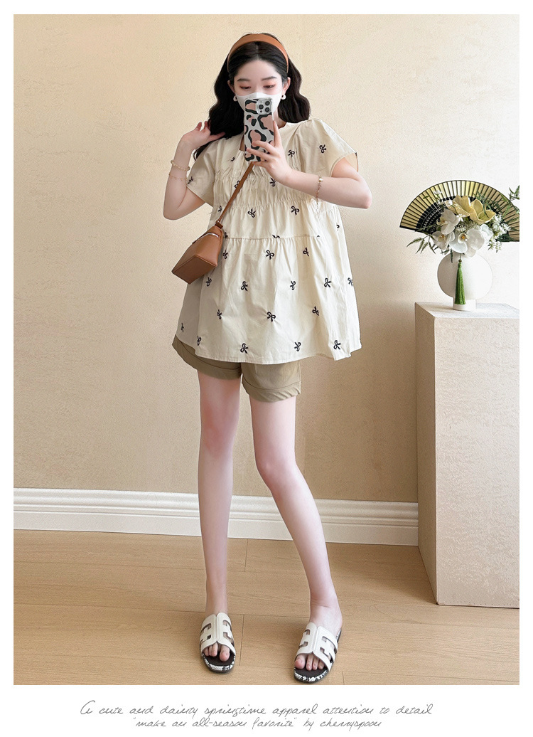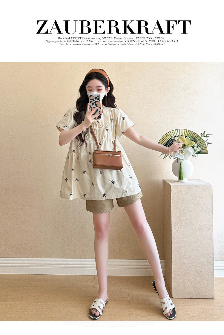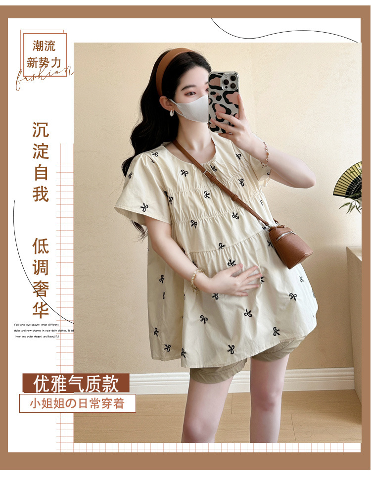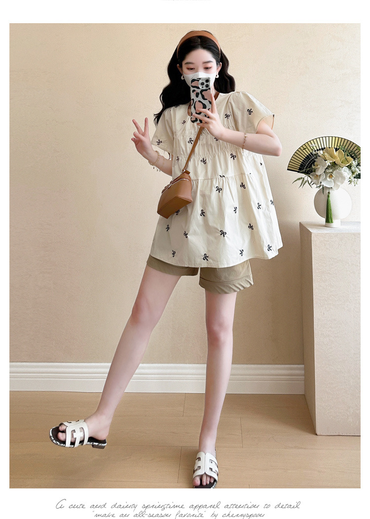 Фактический снимок нового корейского топа для беременных 2025 года с летающими рукавами и бантом, вышитый, уменьшающий возраст, топ + шорты для поддержки живота