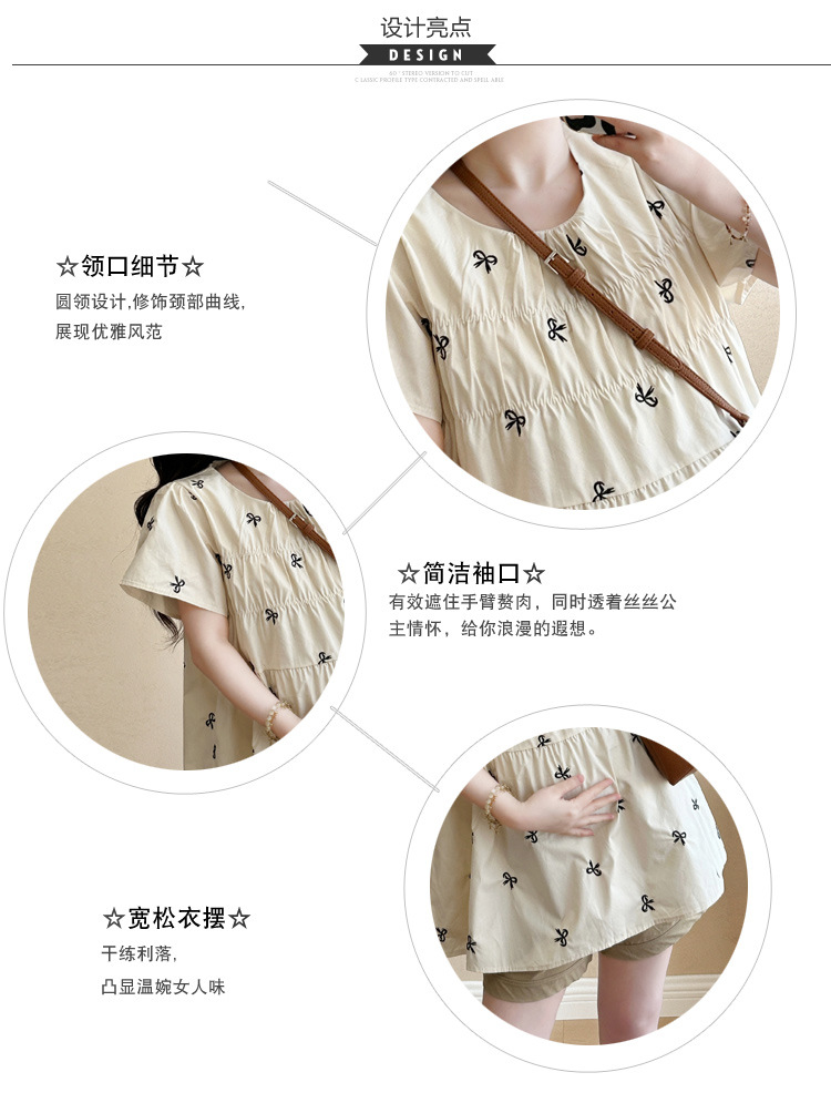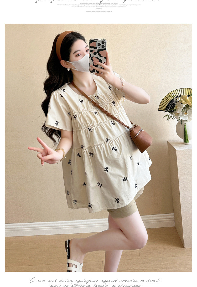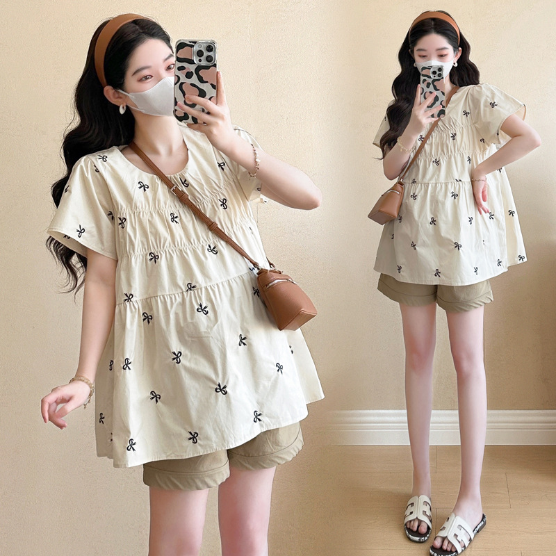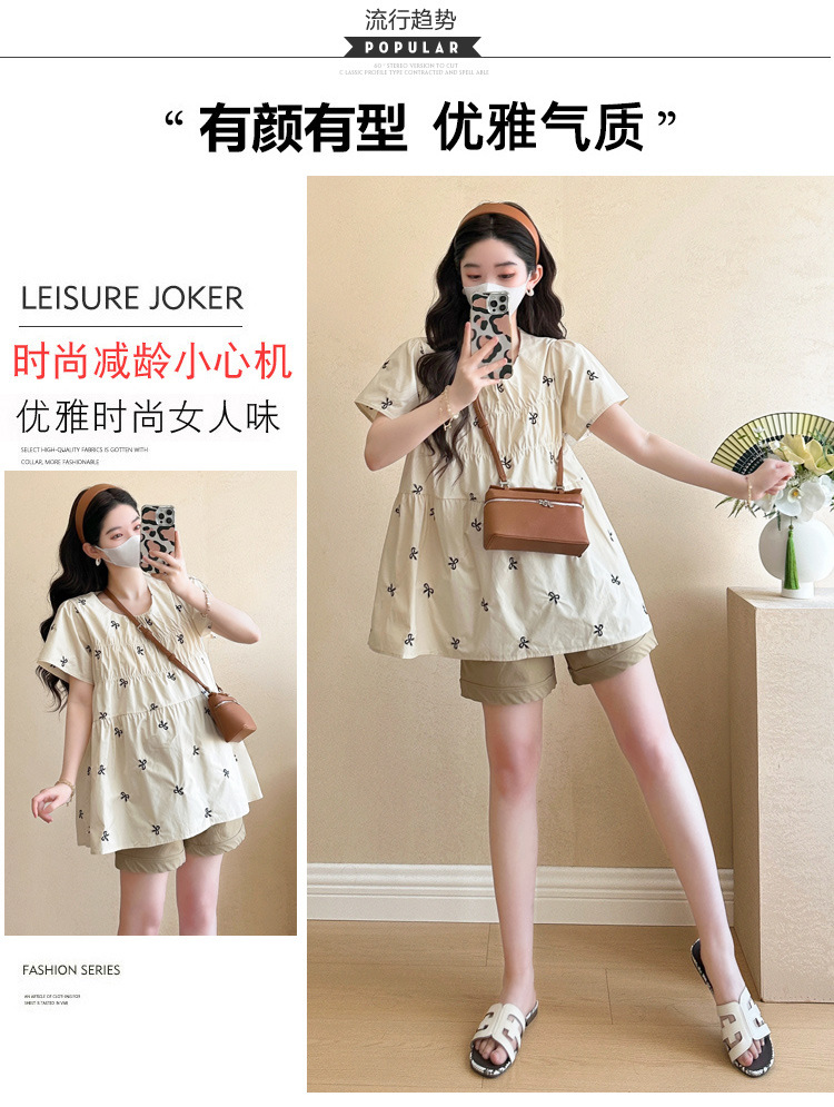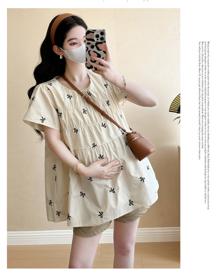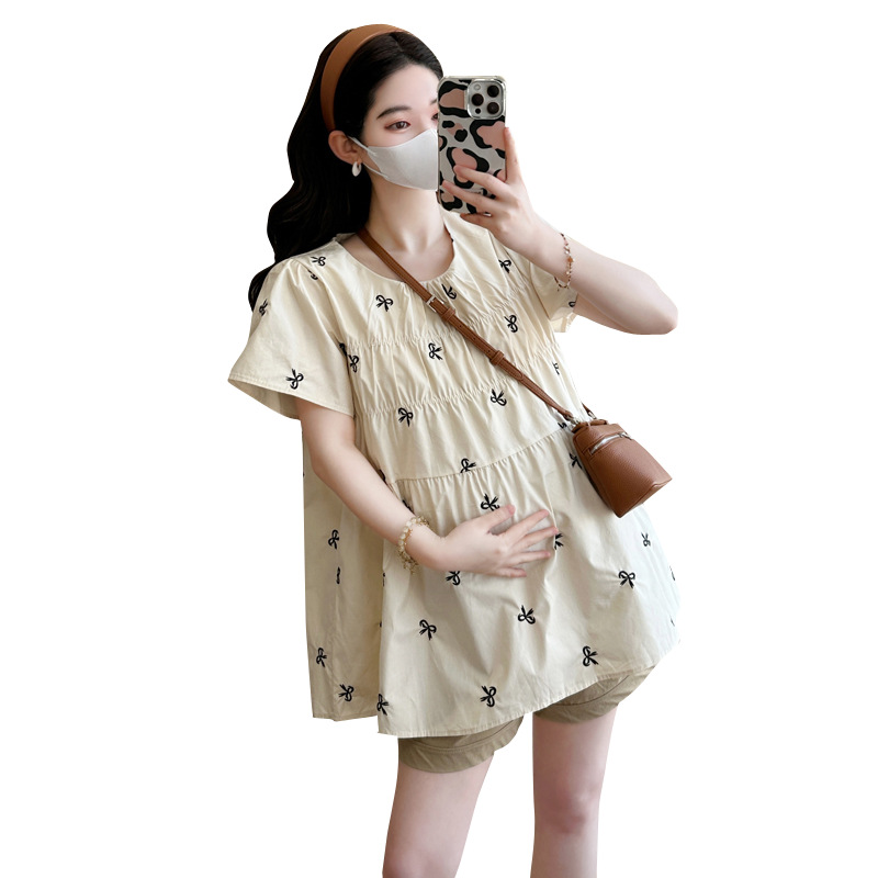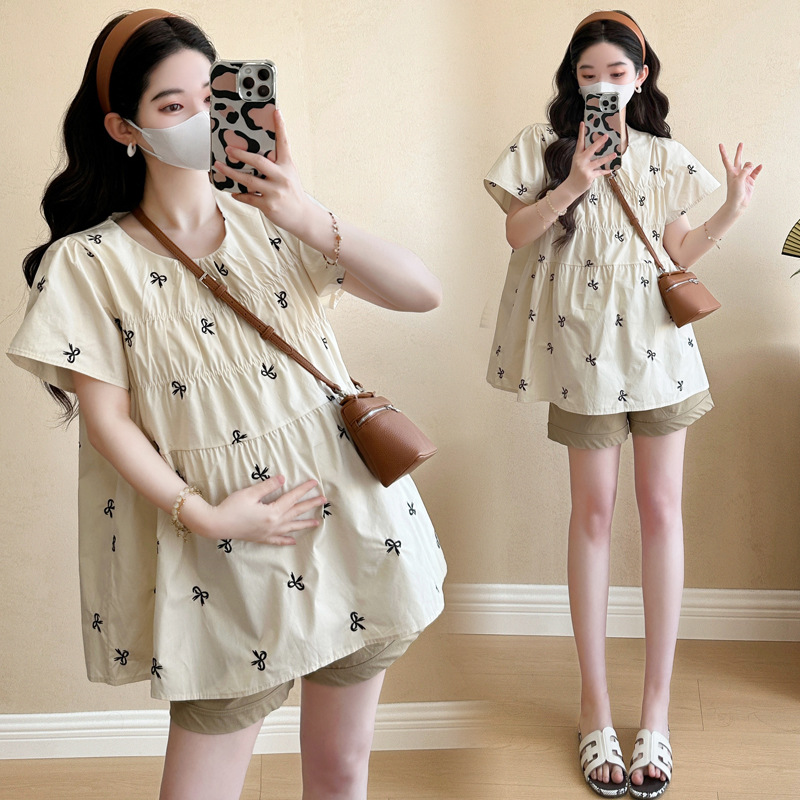 Фактический снимок нового корейского топа для беременных 2025 года с летающими рукавами и бантом, вышитый, уменьшающий возраст, топ + шорты для поддержки живота