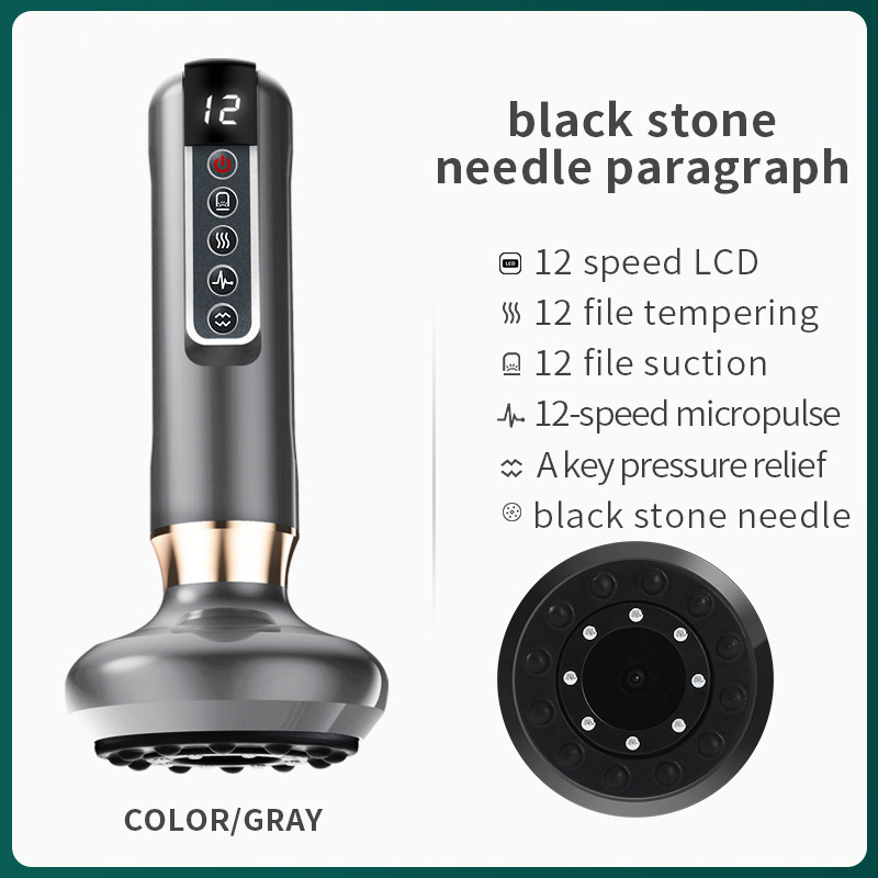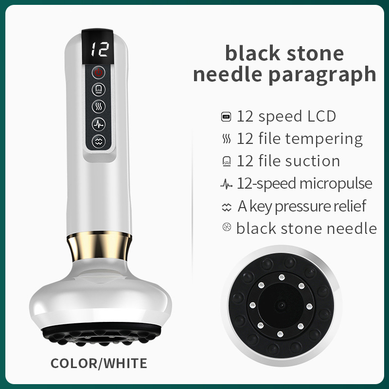 液晶显示屏、12档红光加热、12档负压力度、一键卸压、脉冲微电流、天然砭石