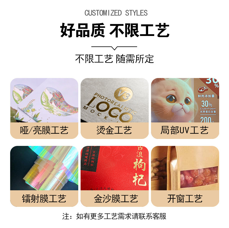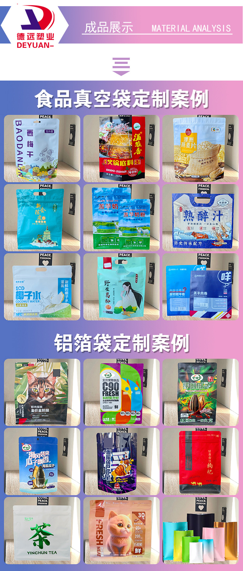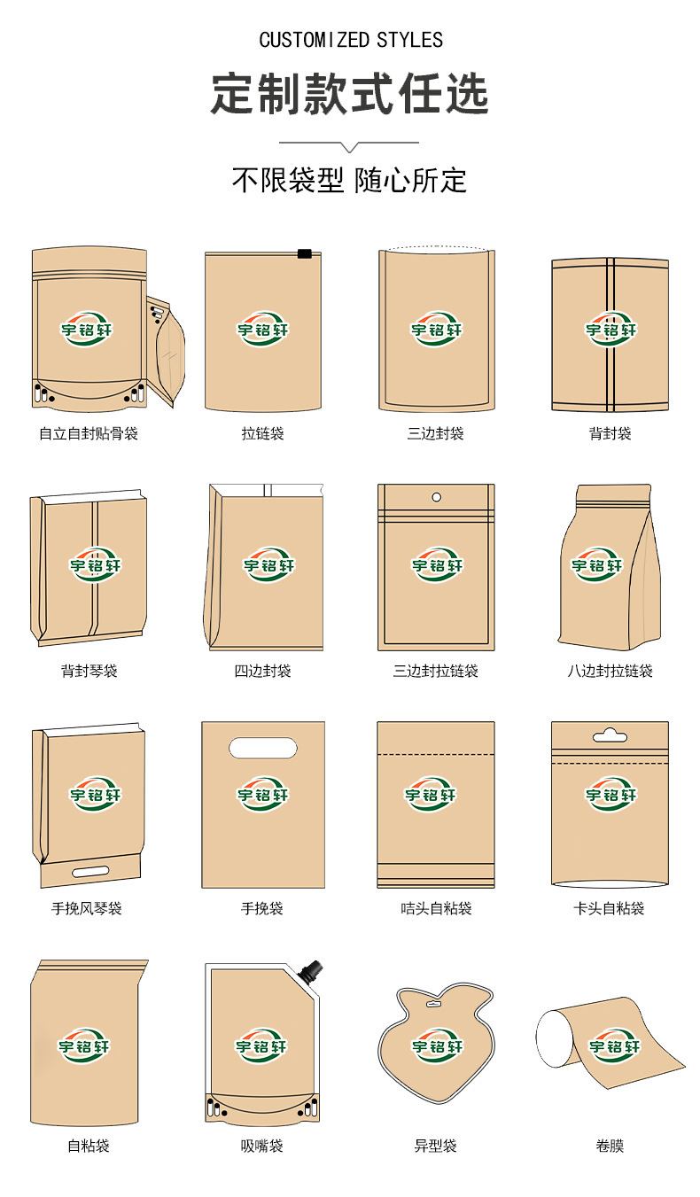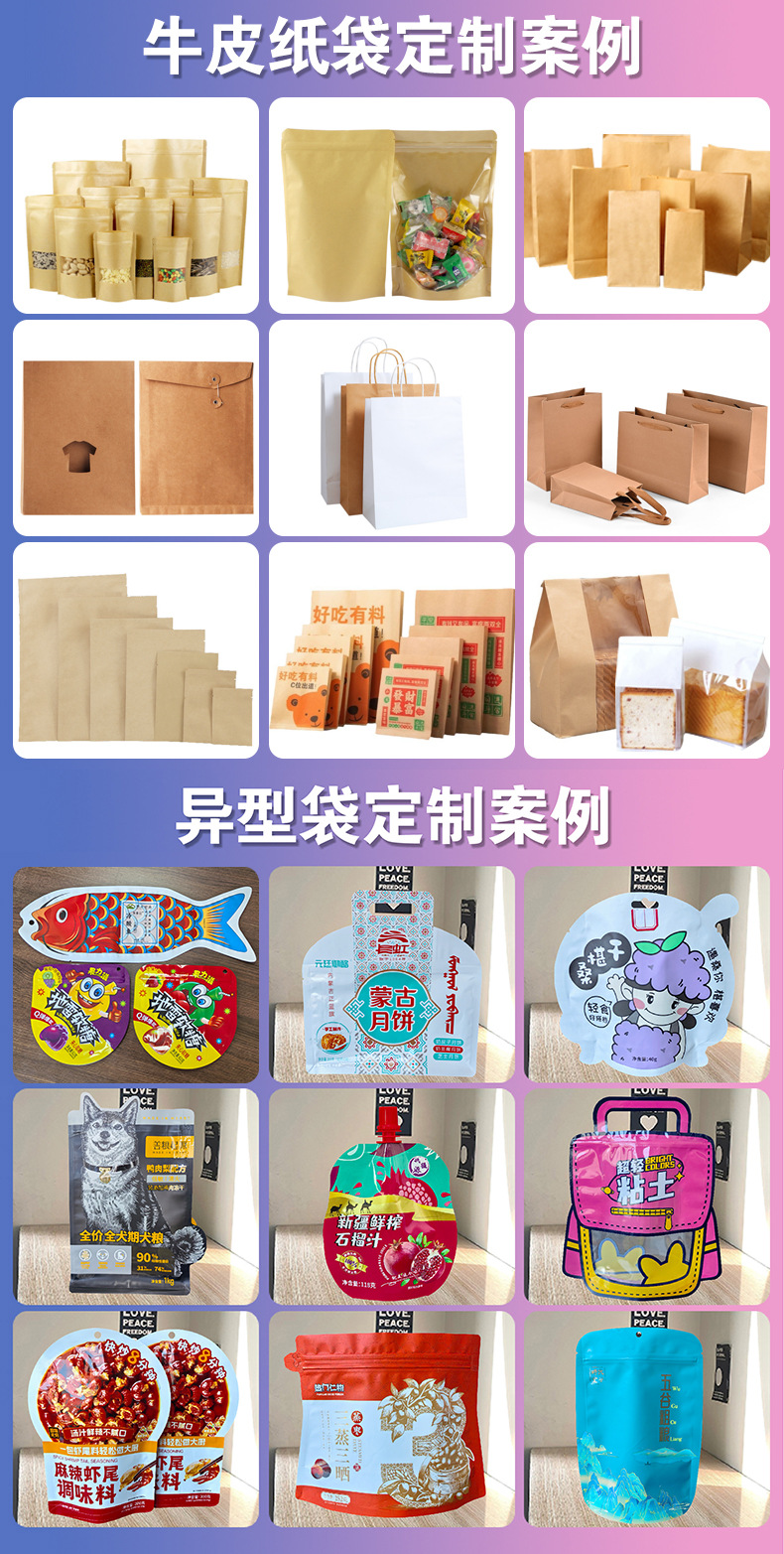 Вакуумные пакеты с трехсторонней герметизацией по индивидуальному заказу.; Индивидуальный мешок для рисового кирпича со средней запечаткой; Индивидуальные пакеты из алюминиевой фольги; Индивидуальные отдельно стоящие пакеты с застежкой-молнией; Индивидуальный отдельно стоящий мешок с носиком; персонализированная сумка; Индивидуальная восьмигранная печать; персонализированные пакеты для пивных напитков; Индивидуальные пакеты из крафт-бумаги; Другие упаковочные пакеты специальной формы по индивидуальному заказу; Индивидуальная композитная упаковочная пленка для рулонной пленки; Другие стили по индивидуальному заказу