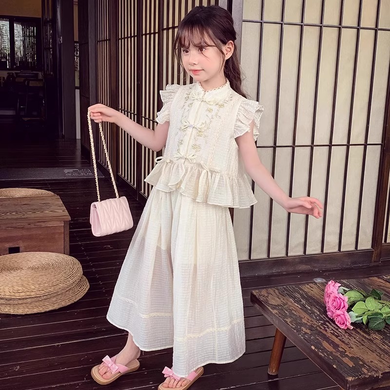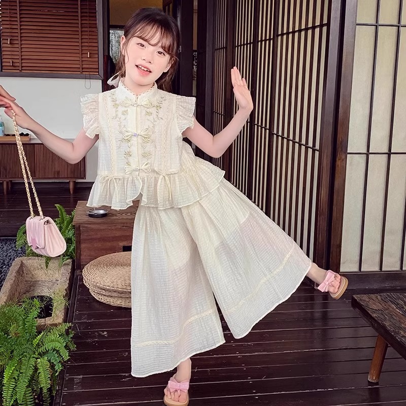 Новый китайский стиль широкий набор брюк для девочек маленькая девочка летняя одежда 2025 новый иностранный детский досуг набор из двух частей