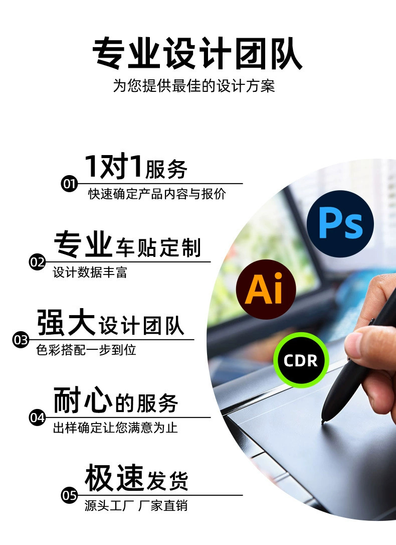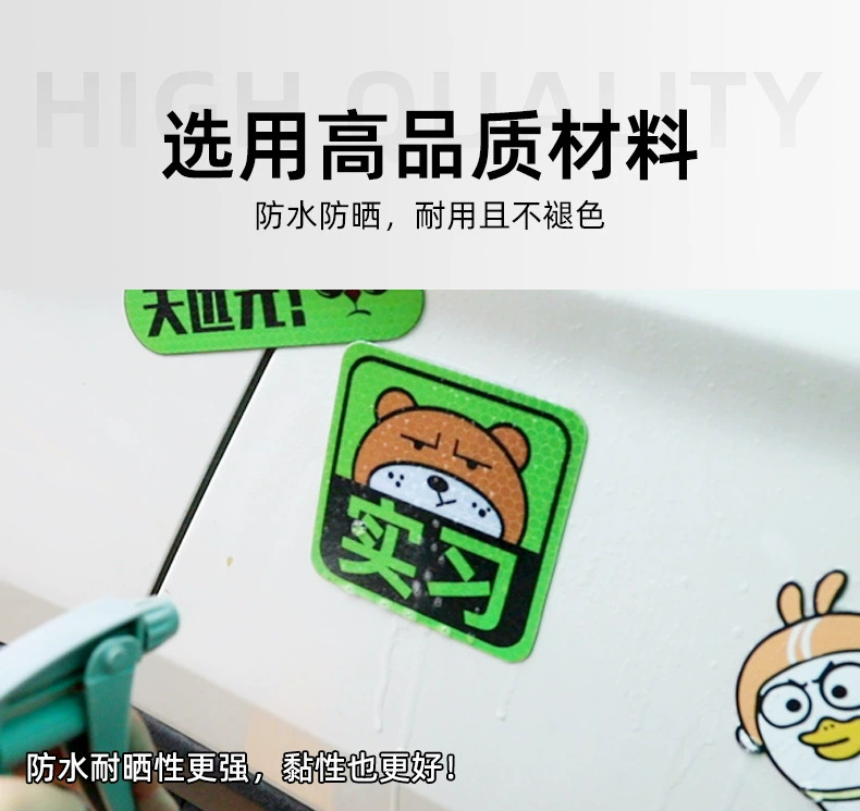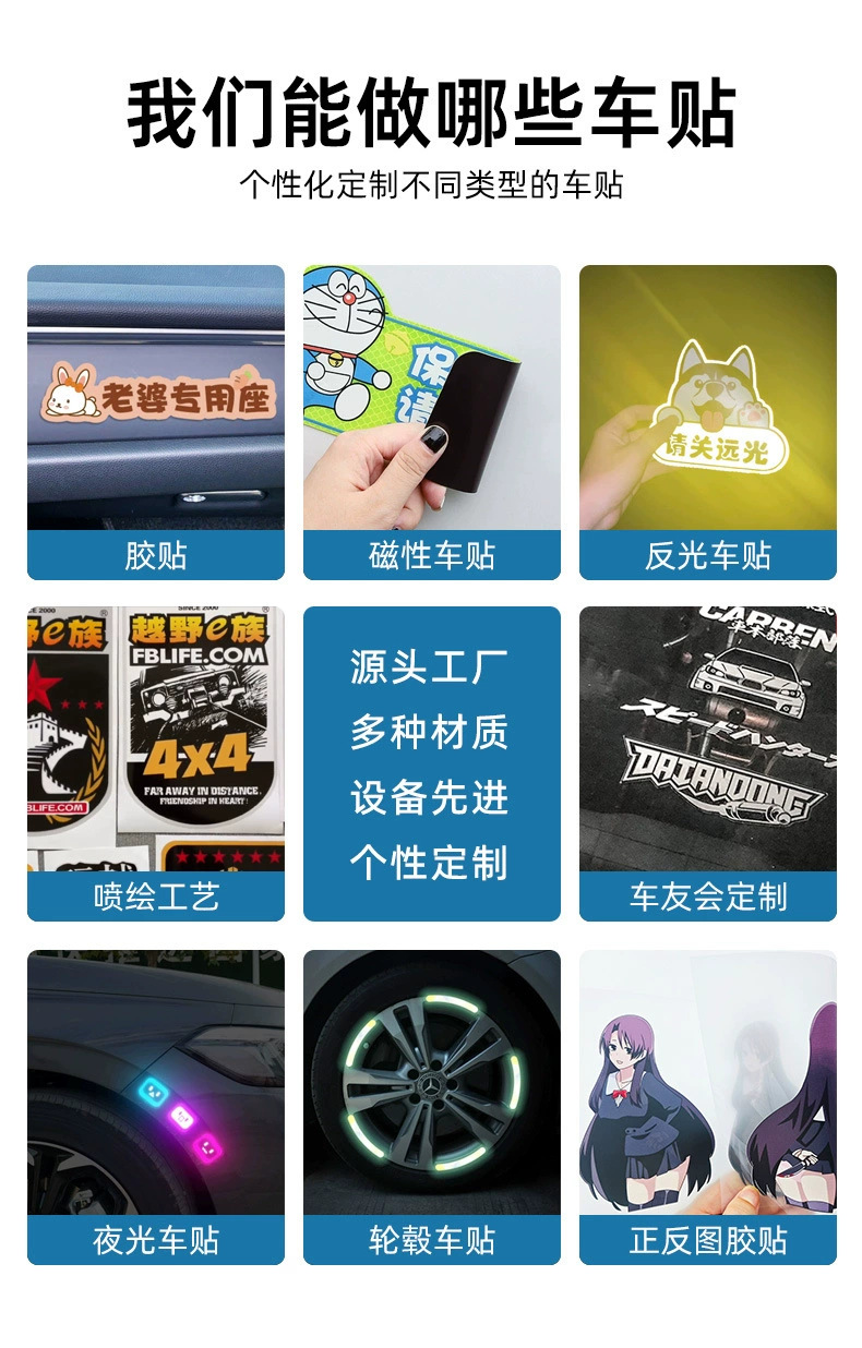 Клейкая лента; Светоотражающие наклейки; Магнитные наклейки; Позиция стажера; Прозрачная наклейка; Полая наклейка; Светящиеся в темноте наклейки; Наклейка на колесо; Наклейки с изображением спереди и сзади; Красочные лазерные наклейки