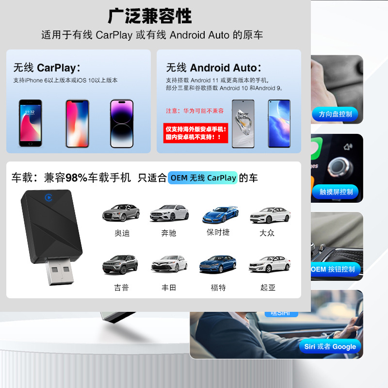 Заводская оптовая продажа кастомного беспроводного адаптера CarPlay, оригинальный проводной адаптер CarPlay для беспроводного подключения, 2-в-1