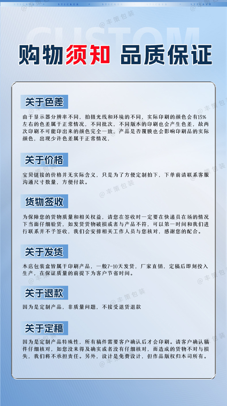 Наклейки из мелованной бумаги [высокая экономичность, сверхпрочный клей]; Наклейка для переноса [хрустальная наклейка, оторвите пленку и оставьте слова, слегка выпуклый эффект]; Прозрачный ПВХ [водонепроницаемая наклейка, маслостойкая и устойчивая к разрыву, предпочтительна для охлаждения]; Водонепроницаемый ПВХ [водонепроницаемая наклейка, маслостойкая и устойчивая к разрыву, предпочтительна для охлаждения]; Азиатская серебряная наклейка [водонепроницаемая и маслостойкая, устойчивая к разрыву, без остатков клея, сильная липкость]; Лазерные наклейки [металлическая текстура, красочные и привлекательные]; Наклейки из земляной бумаги [Наклейки из земляной бумаги с уникальной текстурой и высоким качеством]; Посыпанные золотыми стикерами [уникальный внешний вид, премиальное качество и роскошный вид, выбор бренда]; Перламутровые бумажные наклейки [Перламутровые сокровища, аристократия бумаги, выбор для продвижения]; Проконсультируйтесь со службой поддержки клиентов | По индивидуальному заказу