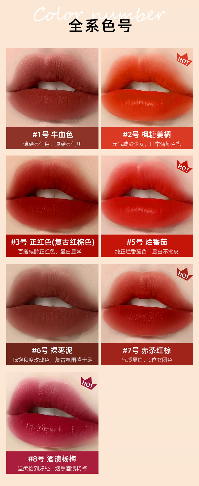 01#Цвет коровьей крови; 02#Кленовый имбирь Апельсин; 03#Настоящий красный; 05#гнилые помидоры; 06#Паста из голого мармелада; 07#красный чай красно-коричневый; 08#Берри с винным пятном