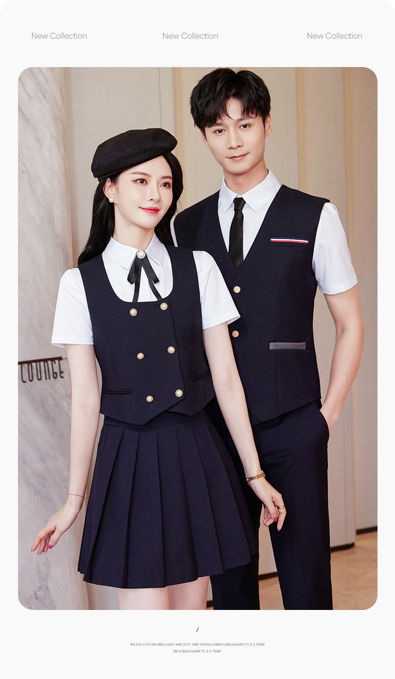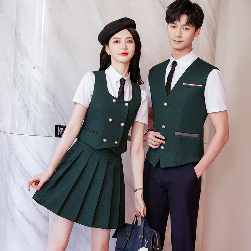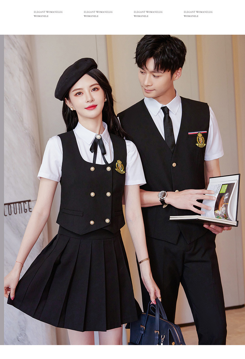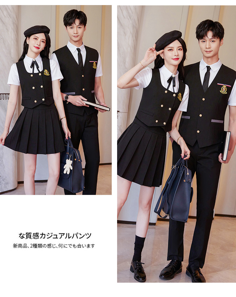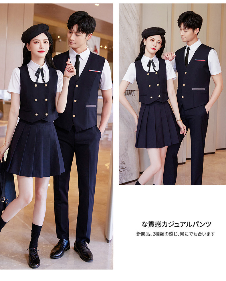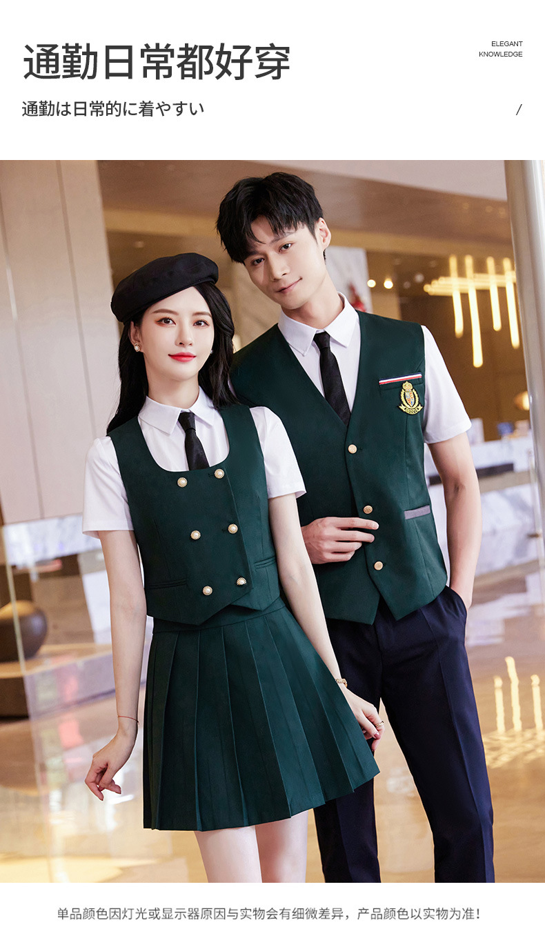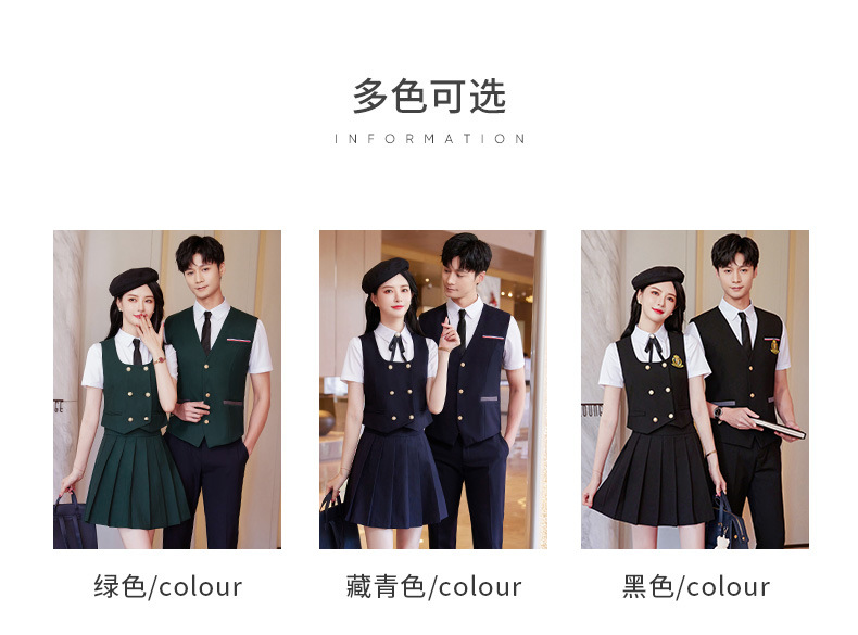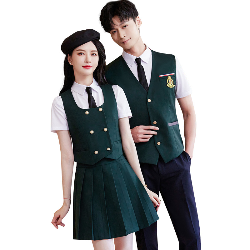 Женский зеленый жилет; Женский темно-синий жилет; Женский черный жилет; Мужской зеленый жилет; Мужской темно-синий жилет; Мужской черный жилет; Женский зеленый жилет + плиссированная юбка; Женский темно-синий жилет + плиссированная юбка; Женский черный жилет + плиссированная юбка; Мужские темно-синие брюки; Мужские черные брюки; Женская белая рубашка с коротким рукавом + воротник цветок; Мужская белая рубашка с коротким рукавом; Юбка-плиссе (примечания по цвету)
