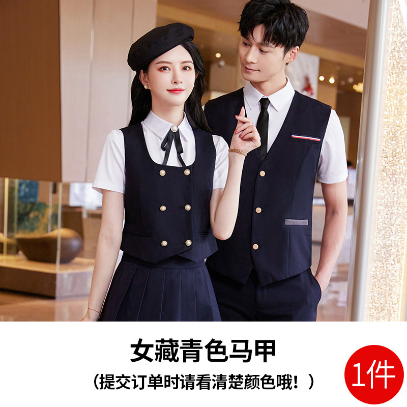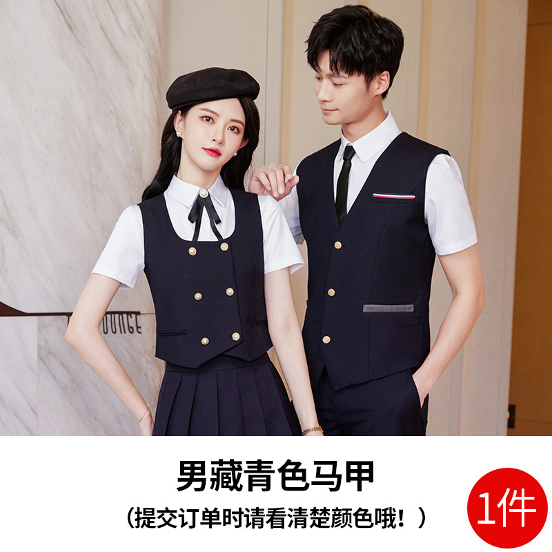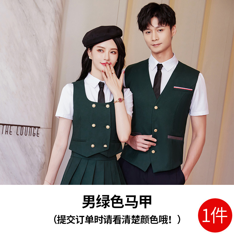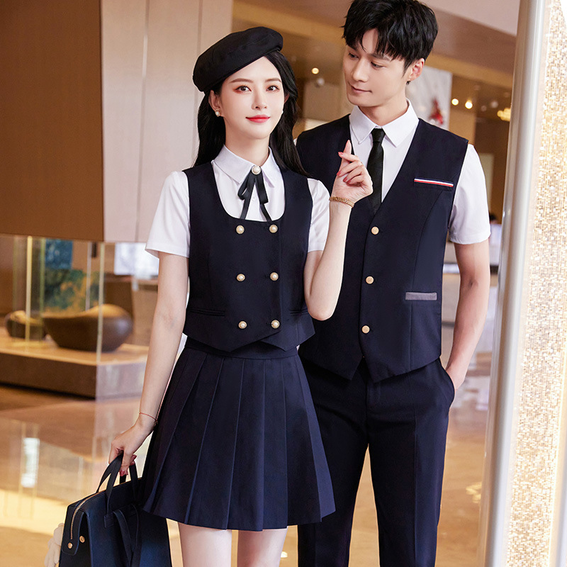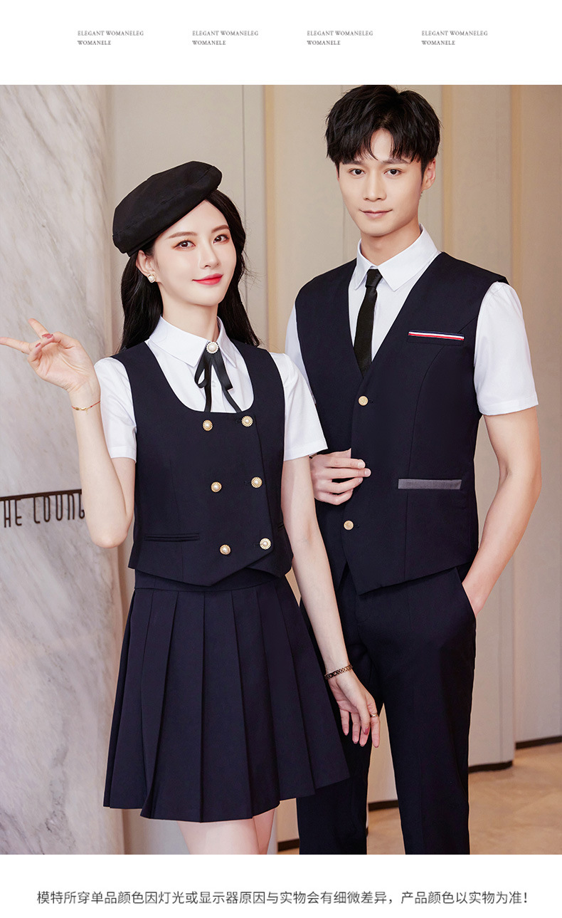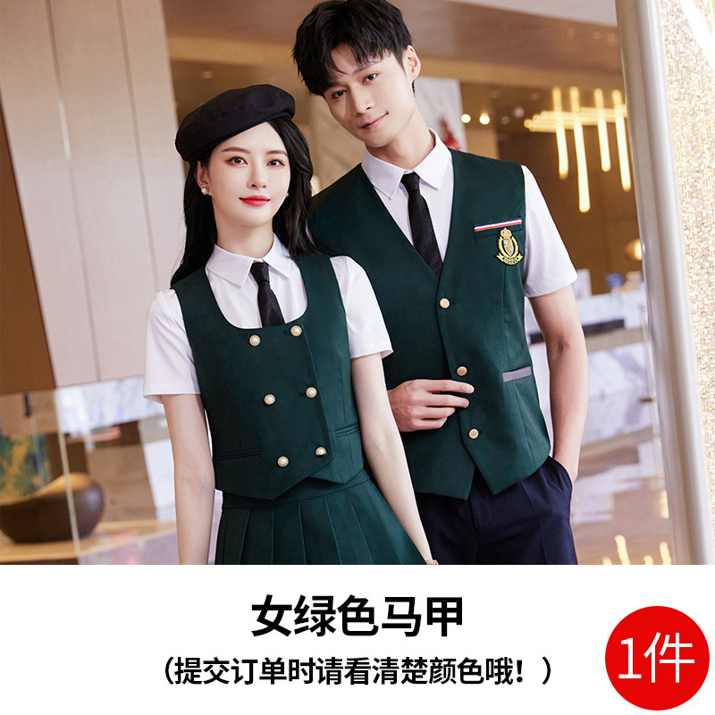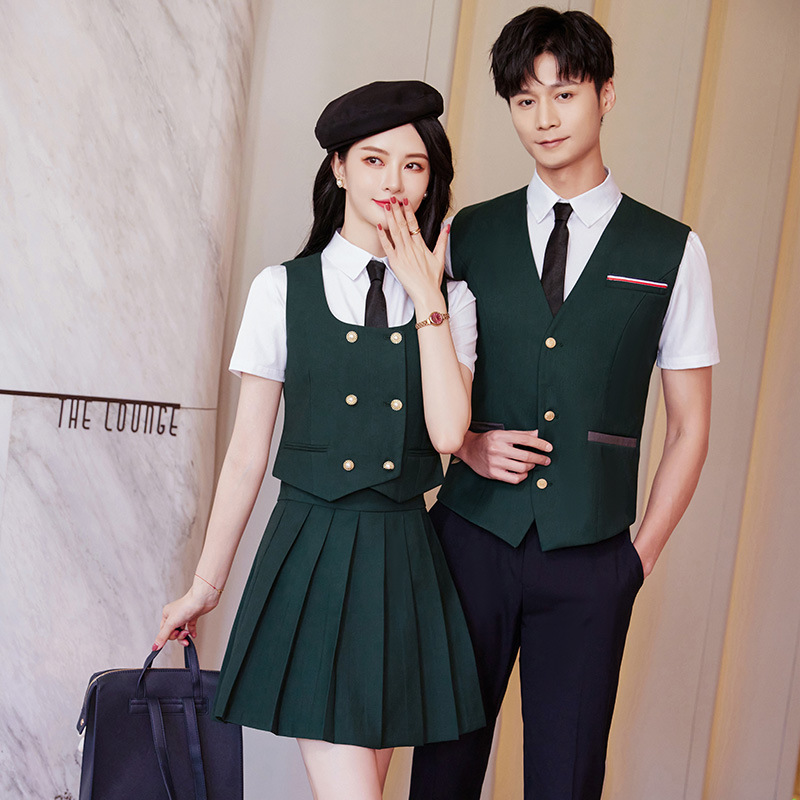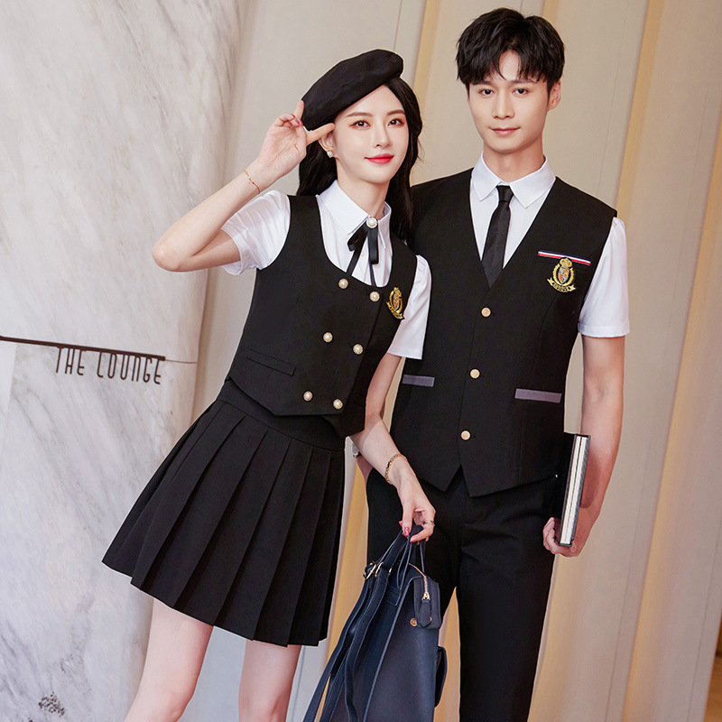 Женский зеленый жилет; Женский темно-синий жилет; Женский черный жилет; Мужской зеленый жилет; Мужской темно-синий жилет; Мужской черный жилет; Женский зеленый жилет + плиссированная юбка; Женский темно-синий жилет + плиссированная юбка; Женский черный жилет + плиссированная юбка; Мужские темно-синие брюки; Мужские черные брюки; Женская белая рубашка с коротким рукавом + воротник цветок; Мужская белая рубашка с коротким рукавом; Юбка-плиссе (примечания по цвету)