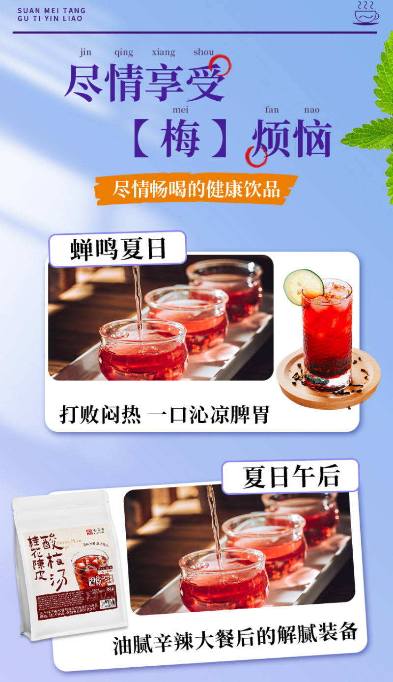 Почтовый старомодный суп из кожуры мандарина, османтуса и кислой сливы в одном стиле, сочетаемый с кисло-сладким портативным соком в индивидуальной упаковке.