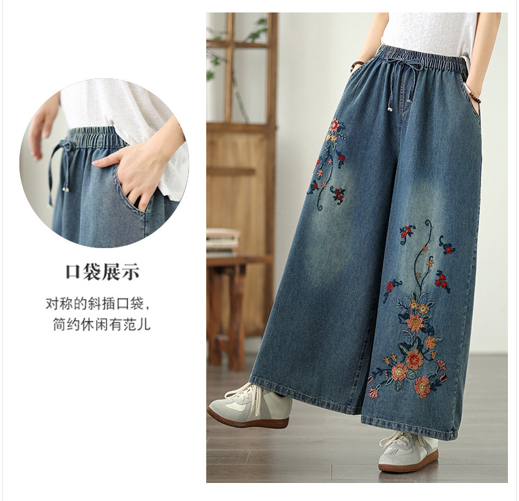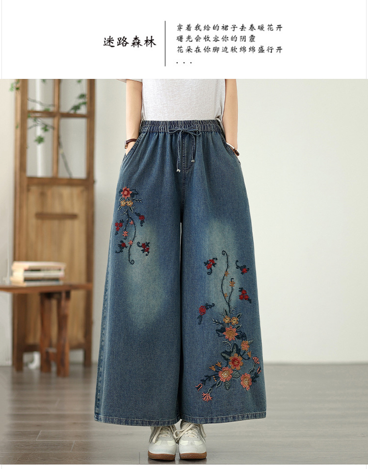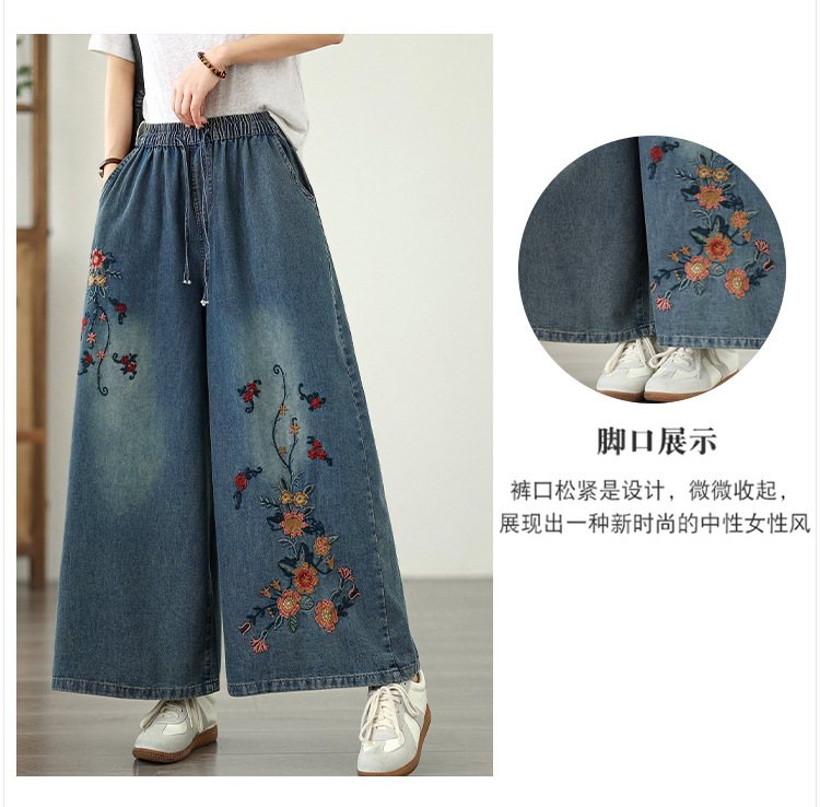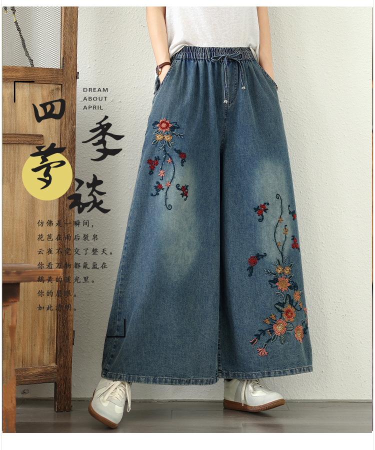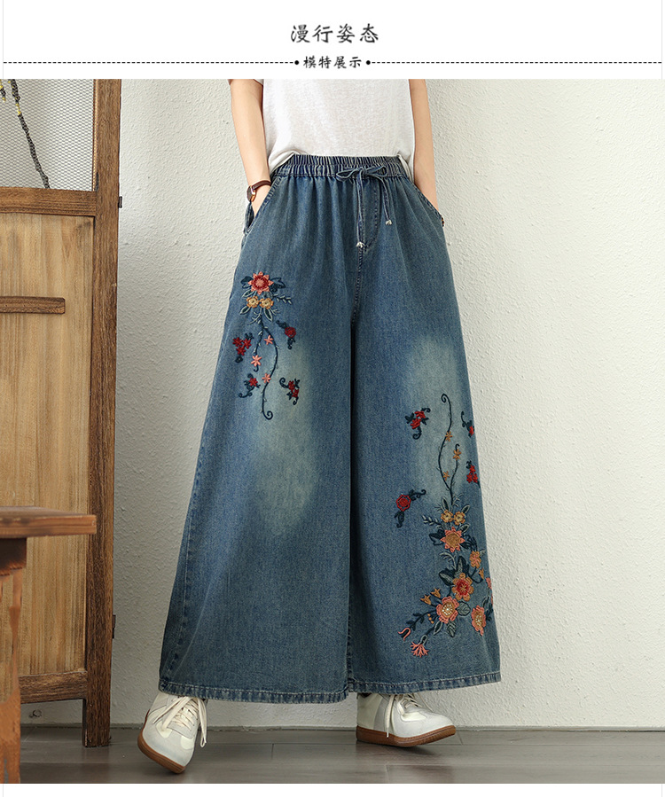 Реальный снимок в наличии тонких мягких джинсовых брюк в стиле ретро с тяжелой вышивкой в этническом стиле с эластичной резинкой на талии, универсальных повседневных широких брюк больших размеров