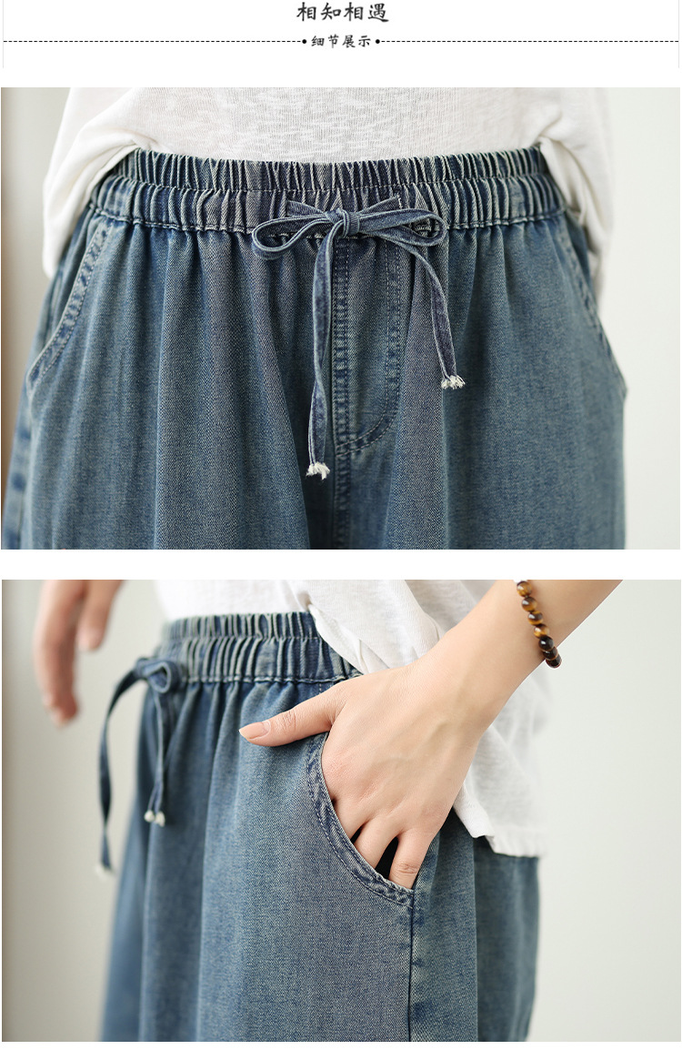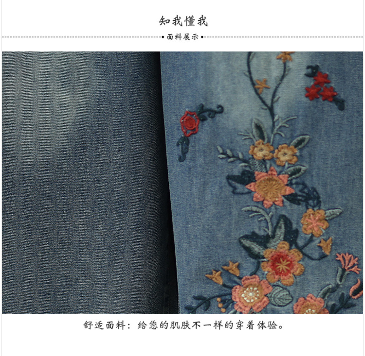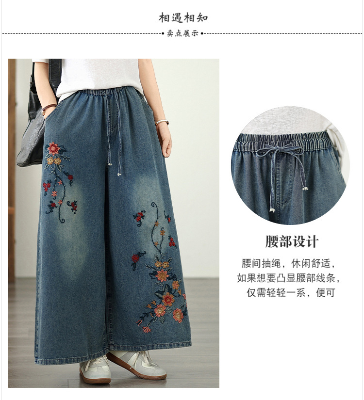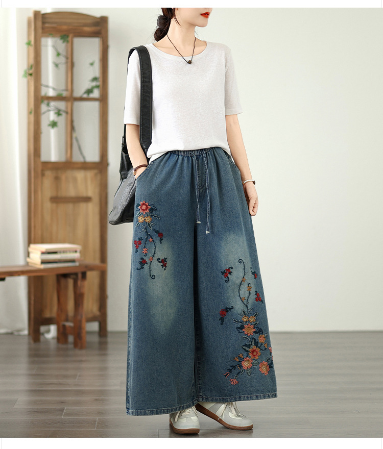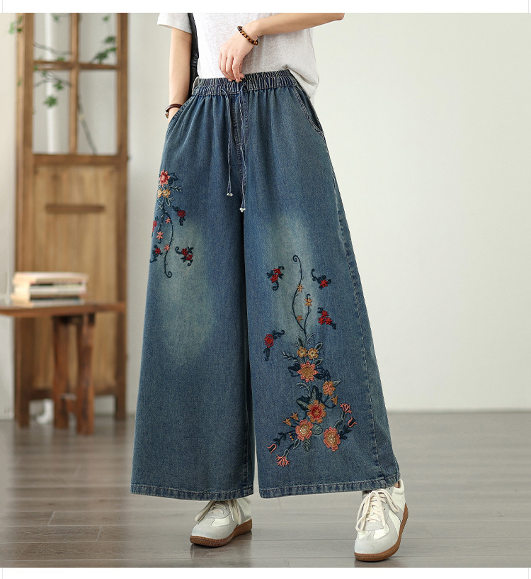 Реальный снимок в наличии тонких мягких джинсовых брюк в стиле ретро с тяжелой вышивкой в этническом стиле с эластичной резинкой на талии, универсальных повседневных широких брюк больших размеров