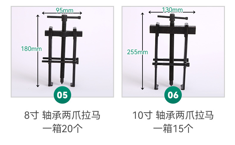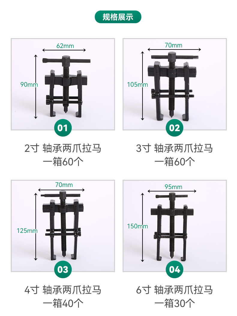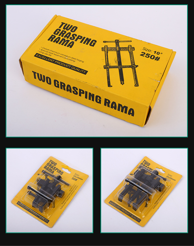 Съемник с двумя захватами для подшипников, 2inch, 10 штук в коробке, 60 штук в картоне.; Съемник с двумя захватами для подшипников, 3inch, 10 штук в коробке, 60 штук в картоне.; Съемник подшипников с двумя захватами, 4inch, 10 штук в коробке, 40 штук в картоне.; Съемник подшипников с двумя захватами, 6inch, 5 штук в коробке, 30 штук в картоне.; Двухкулачковый съемник подшипников, 8inch, 5 штук в коробке, 20 коробок в картоне.; Съемник подшипников с двумя захватами, 10inch, 1 штука в коробке, 15 штук в картоне.