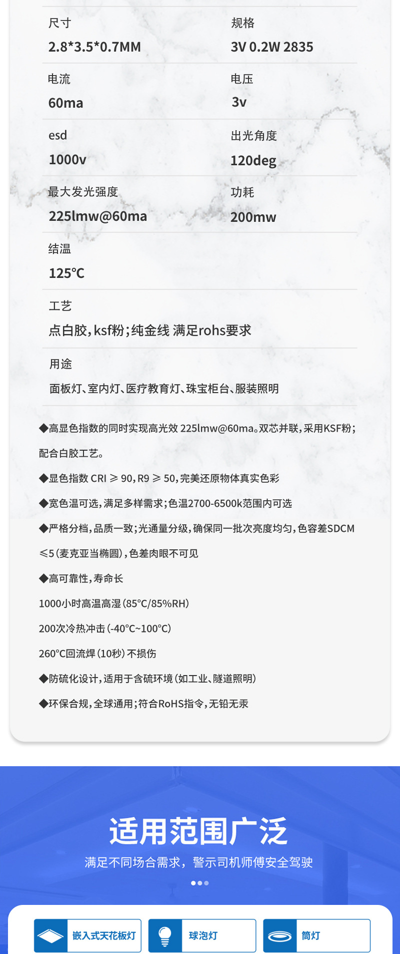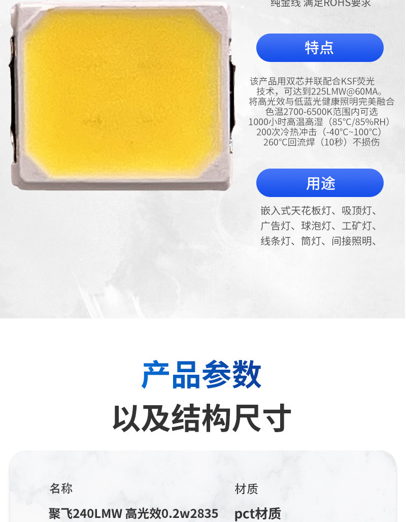 240 лм/Вт, индекс цветопередачи (CRI) выше 90, фактическая мощность 200 лм/Вт, готовый дизайн продукта
