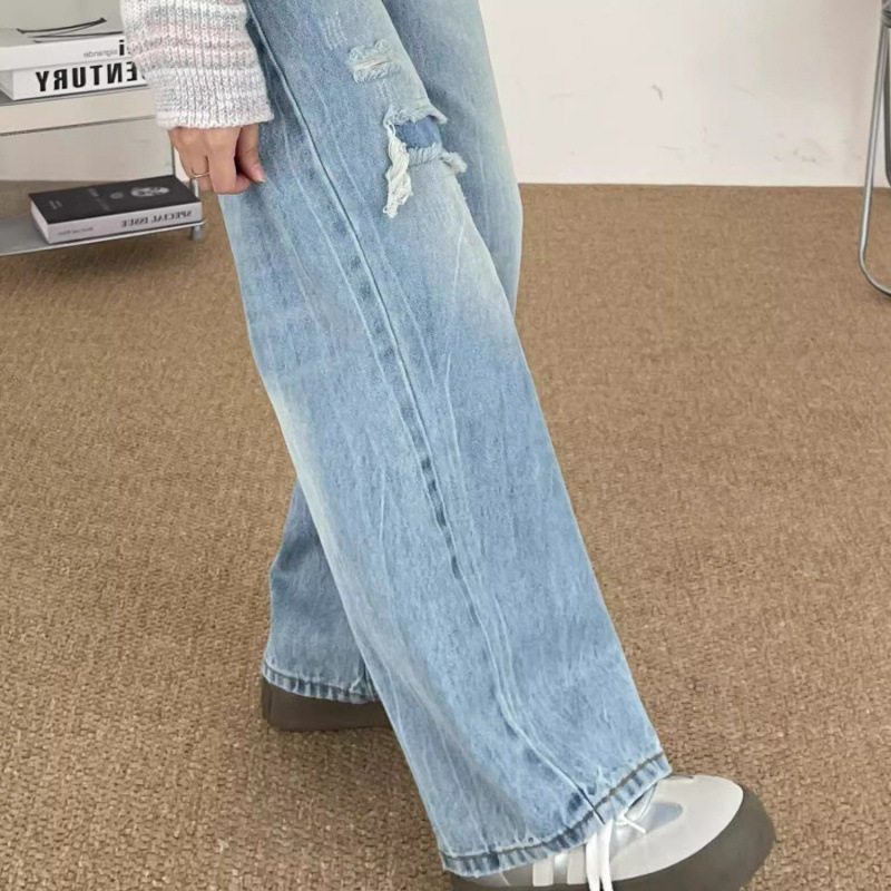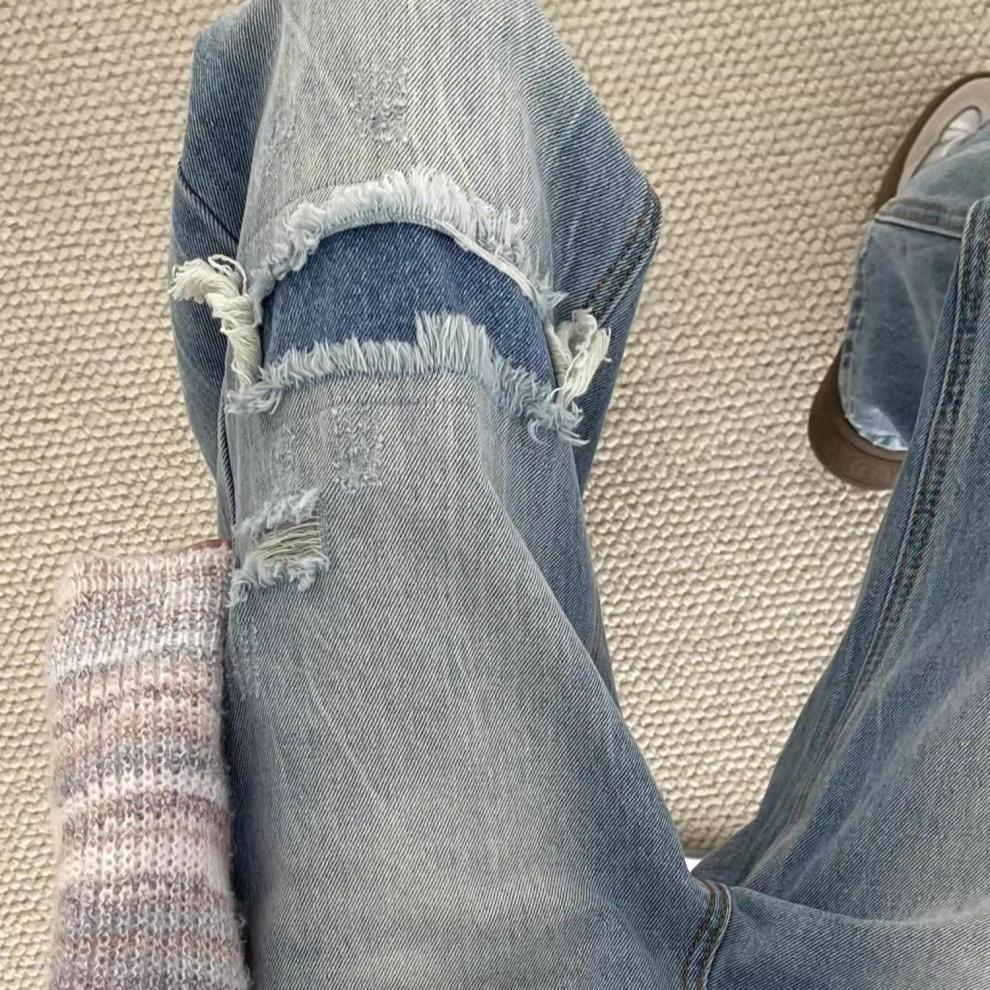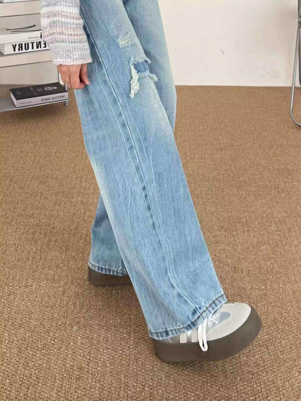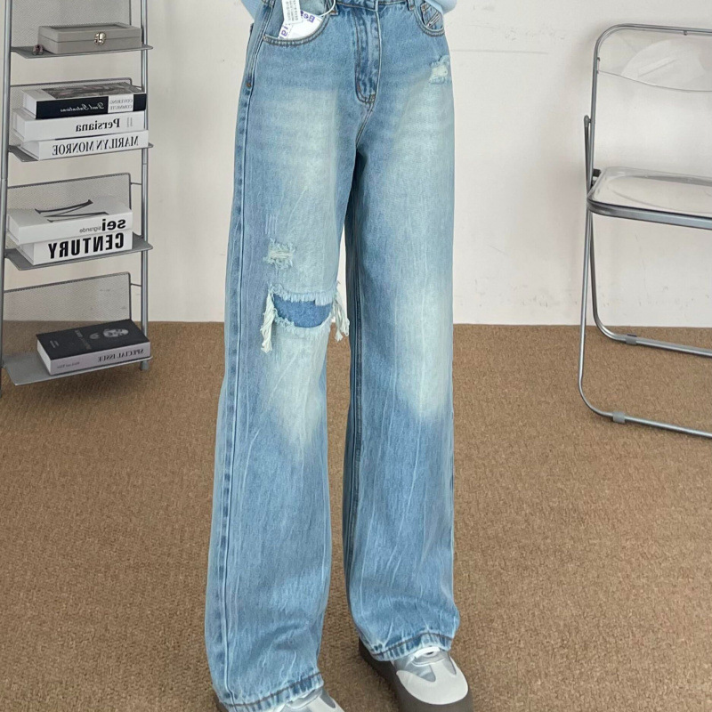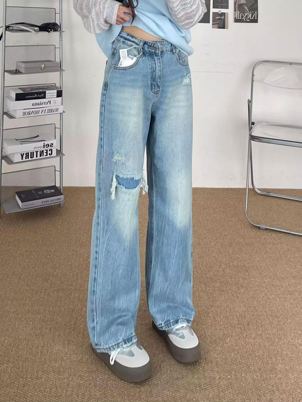 Светло-голубые рваные свободные прямые джинсы для женщин, ранняя весна, новый дизайн, высокая талия, демонстрирующие драпированные брюки-бродяги