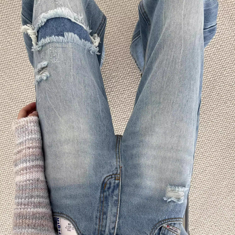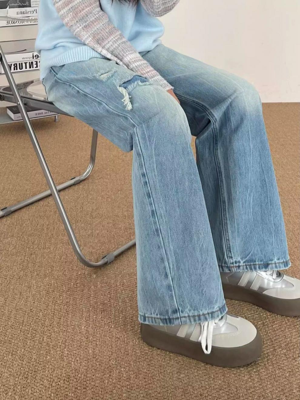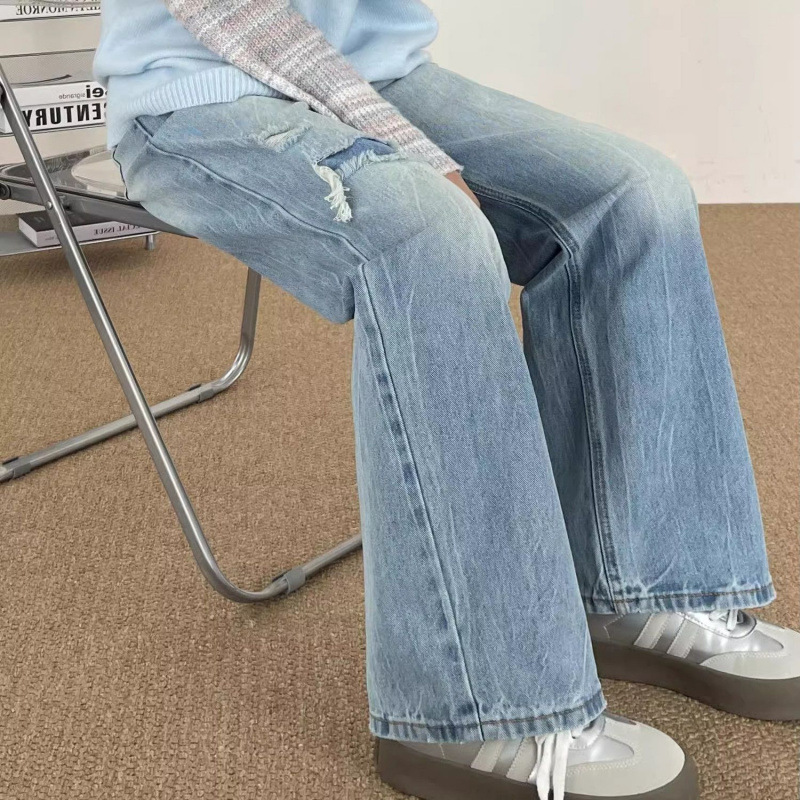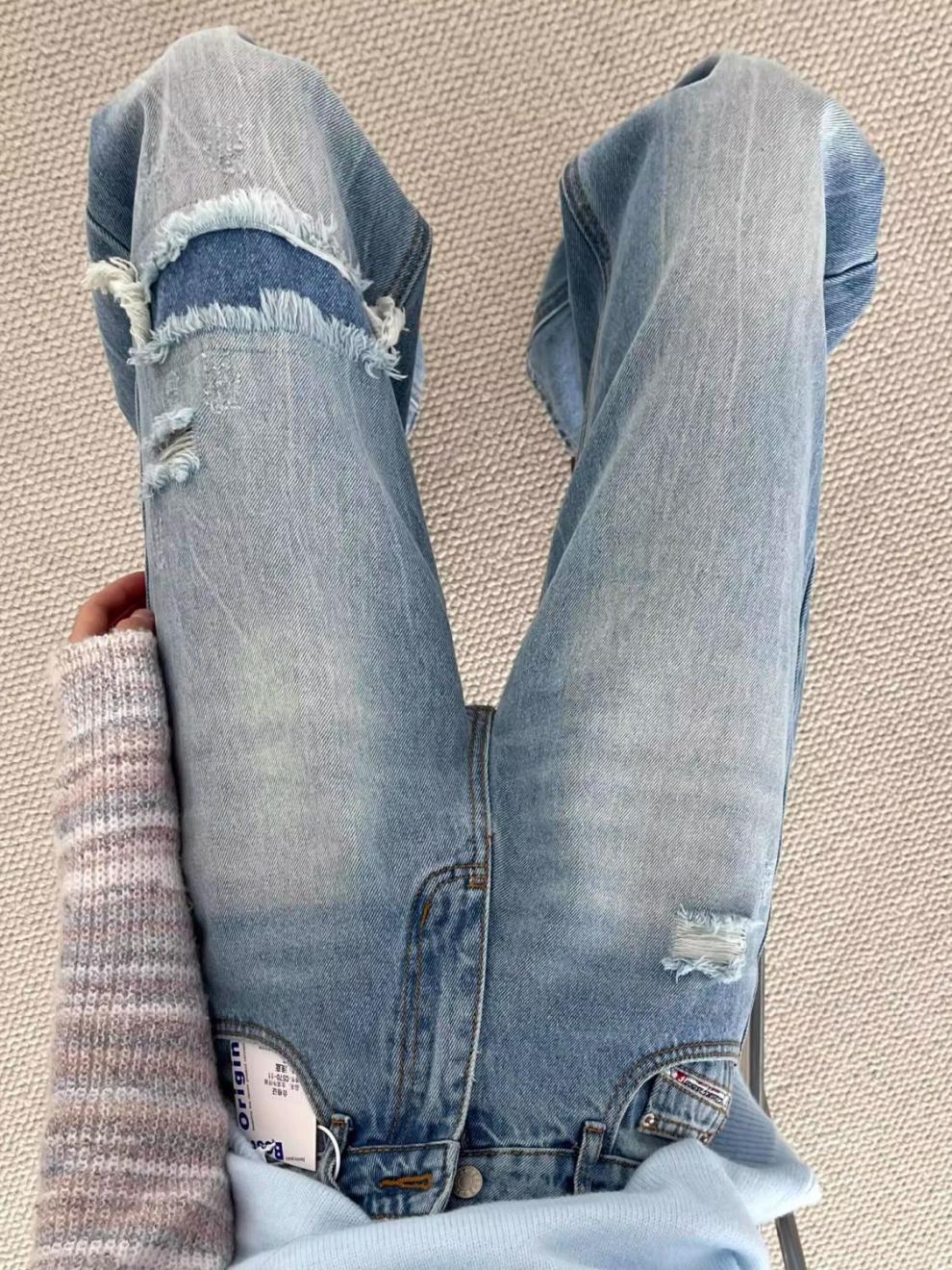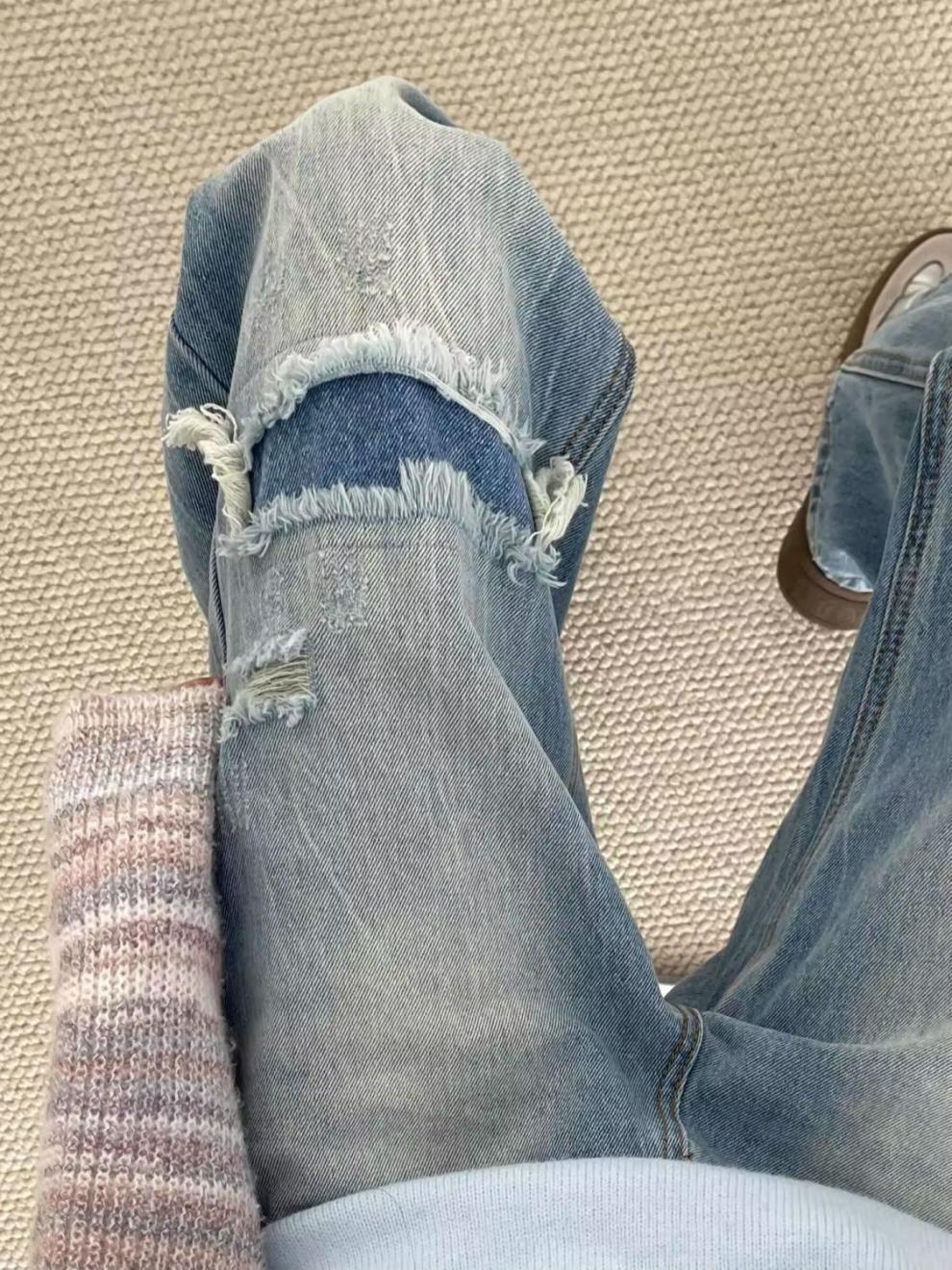Светло-голубые рваные свободные прямые джинсы для женщин, ранняя весна, новый дизайн, высокая талия, демонстрирующие драпированные брюки-бродяги