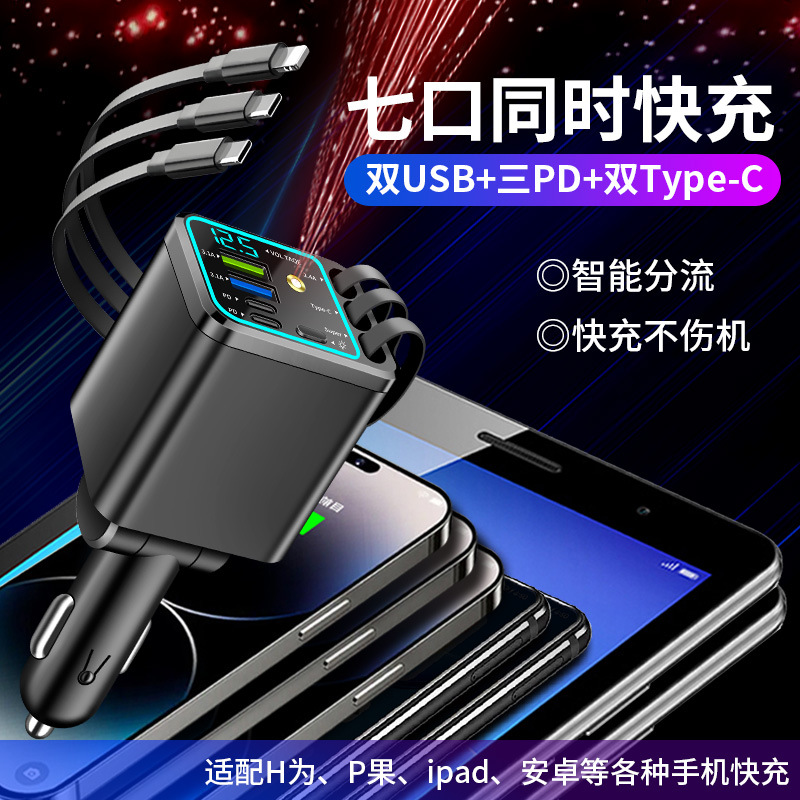 Автомобильная зарядка цифровой дисплей Телескопический кабель Автомобильное зарядное устройство PD Автомобильная быстрая зарядка супер быстрая зарядка пять в одном прикуриватель через границу