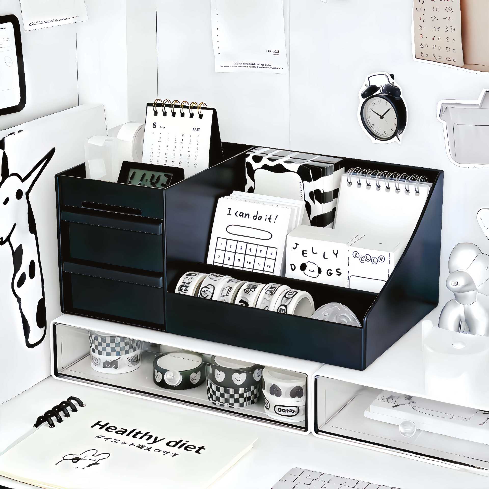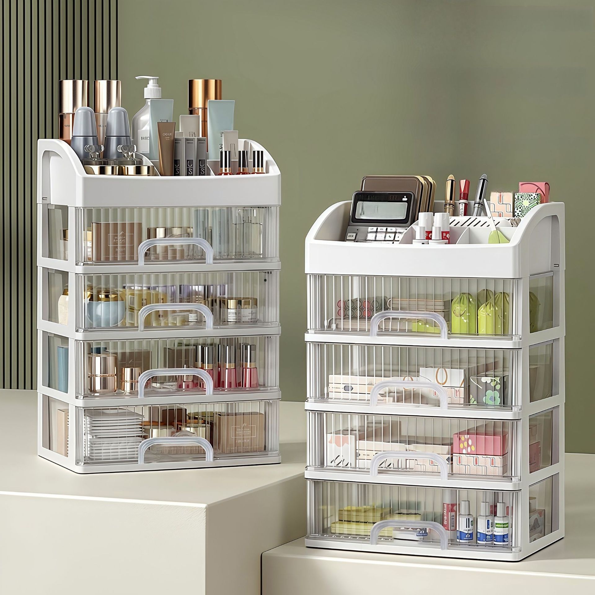 Маленький комод с 2 ящиками - черный (26.5*12*17); Маленький комод с 2 ящиками - белый (26,5*12*17); Маленький комод с 2 ящиками, розовый цвет (26,5*12*17); Маленький кремово-прозрачный ящик (26,5*12*17); Средний комод с 2 ящиками - черный (28.5*12.5*17); Средний комод с 2 ящиками - белый (28,5*12,5*17); 4 уровня и 3 ящика — белый (ящики в полоску); 5 уровней и 4 ящика — белый (ящики в полоску); 4 уровня и 3 ящика — прозрачный черный (ящики в полоску); 5 уровней и 4 ящика — прозрачный черный (ящики с полосатым дизайном)