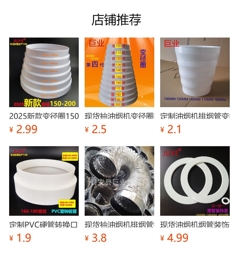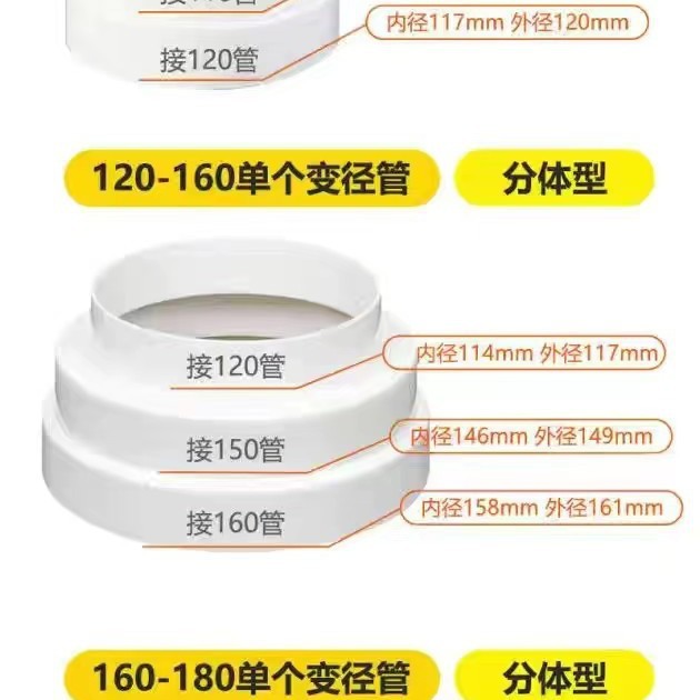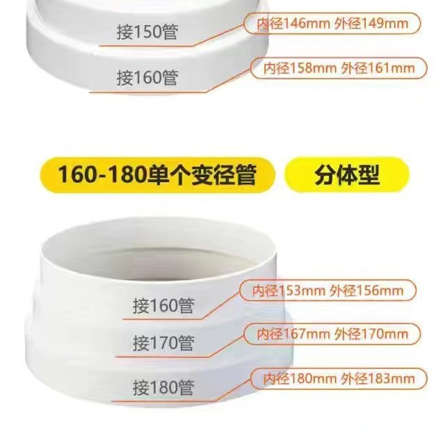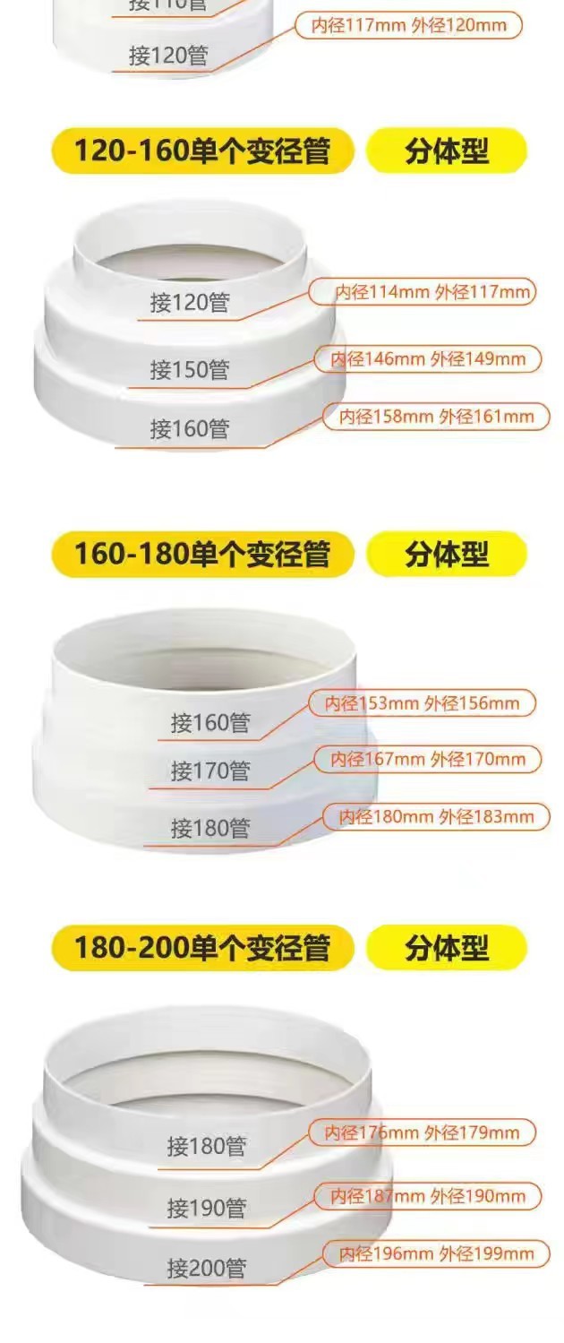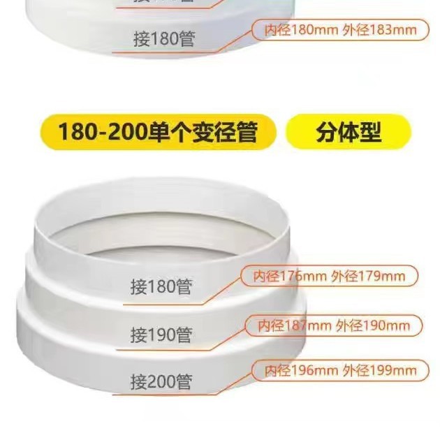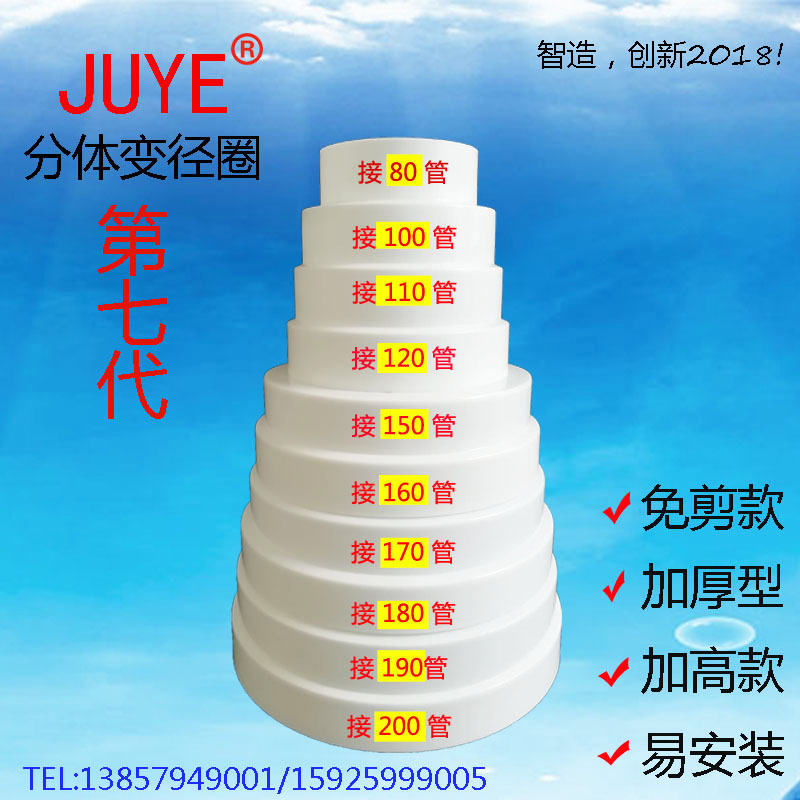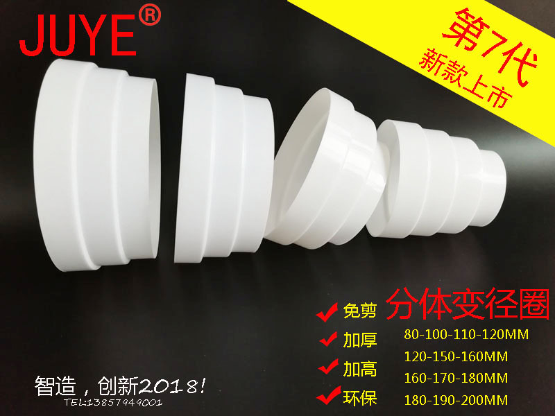 分体变径圈由80-100-120 120-150-160 160-170-180 180-190-200 4个分体组成。一改整体免剪更方便,厚度大约是2MM,材质为PP,160个/件。