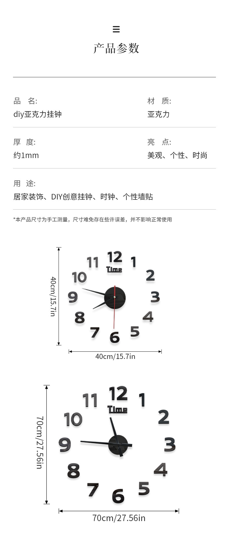 尺 寸:小号尺寸40-50CM(有秒针), 大号尺寸60-80CM(没有秒针),注:这是DIY钟表,可 自定尺寸安装适当放大或缩小!