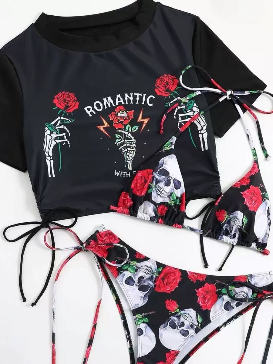Новый внешнеторговый популярный в Европе и Америке сексуальный женский купальник, комплект из трех предметов, фиксированная версия с розовым черепом и принтом на шнуровке с воротником-стойкой