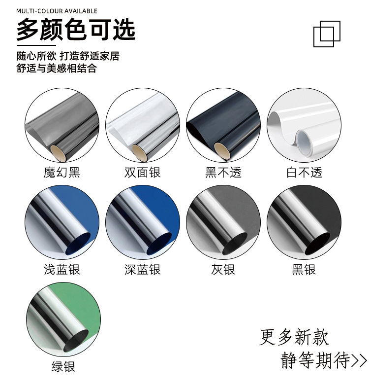 Волшебный черный (двусторонняя перспектива) (хит продаж для внешней торговли); Черный и непрозрачный (полная затемнение); Зеленое серебро (односторонняя перспектива); Светло-голубое серебро (односторонняя перспектива); Черный и серебристый (односторонняя перспектива); Белый и непрозрачный (полная затемнение); Двустороннее серебро (односторонняя перспектива) (горячая модель для внешней торговли); Серо-серебристый (односторонняя перспектива); Темно-синее серебро (односторонняя перспектива); Золото и серебро (односторонняя перспектива)