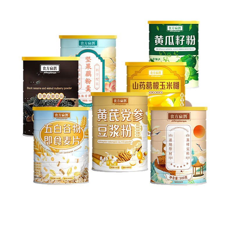 Овсянка быстрого приготовления «Пять белых зерен» 500г/банка; Черный кунжут, грецкий орех и шелковица порошок 500г/банка; Астрагал и кодонопсис, соевое молоко в порошке, 500 г/банка; Суп из крохмалия корня лотоса с орехами 500г/банка; Железный порошок ямса 500г/банка; Ям, пуэрария и кукурузная паста 500г/банка; Порошок семян огурца 500г/банка