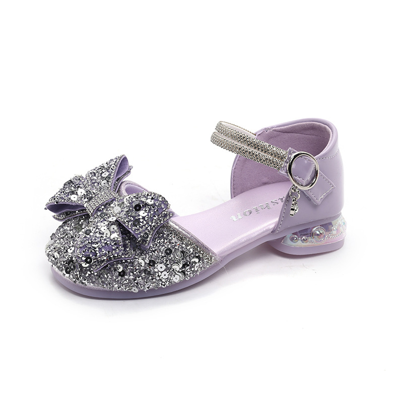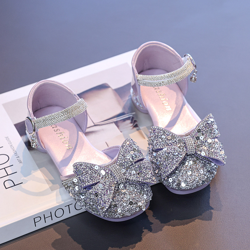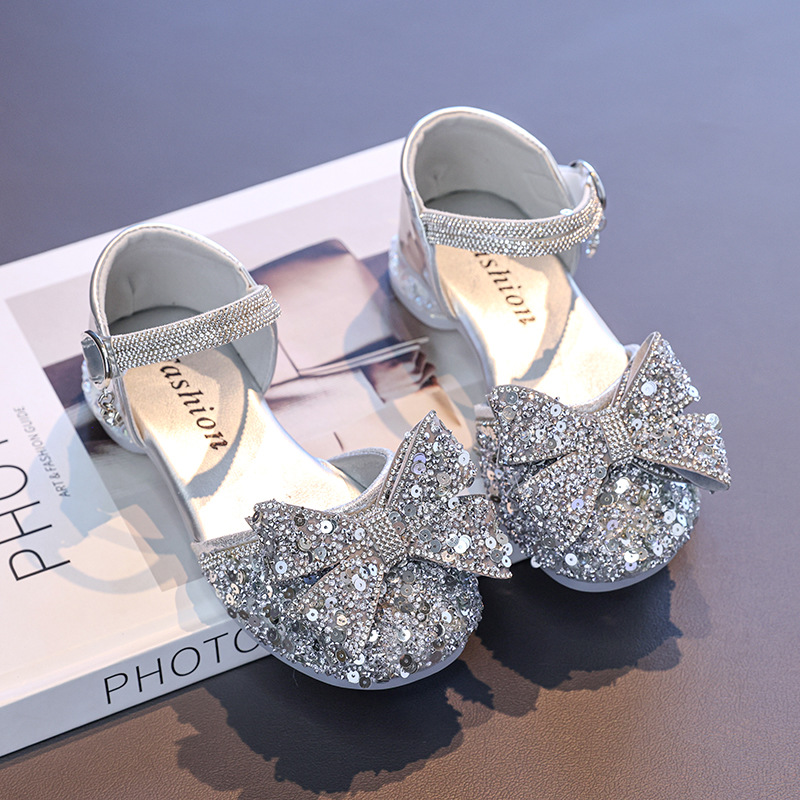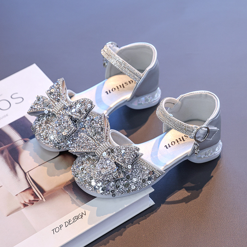 Маленькие высокие каблуки Принцесс обувь со стразами для девочек летом 2025 года маленькая девочка стразы большие ботинки с бантом