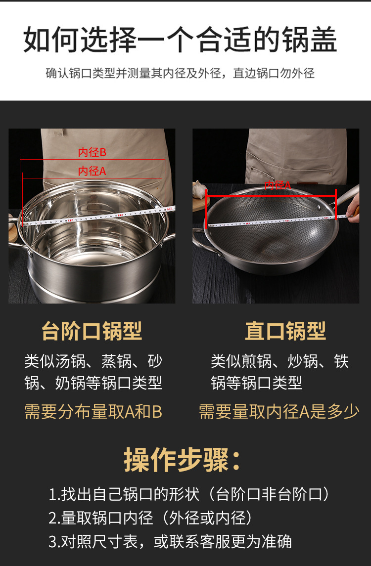 Крышка кастрюли диаметром 28 см [подходит для кастрюль диаметром 26–27,5]; Крышка кастрюли диаметром 30 см [подходит для кастрюль диаметром 28–29,5]; Крышка кастрюли диаметром 32 см [подходит для 30-31,5 кастрюль]; Крышка кастрюли диаметром 34 см [подходит для кастрюль диаметром 32–33,5]; Крышка кастрюли диаметром 36 см [подходит для кастрюль диаметром 34–35,5]; Крышка кастрюли диаметром 38 см [подходит для кастрюль диаметром 36–37,5]; Крышка кастрюли диаметром 40 см [подходит для кастрюль 38-39,5]; Крышка кастрюли диаметром 42 см [подходит для кастрюль диаметром 40–41,5]