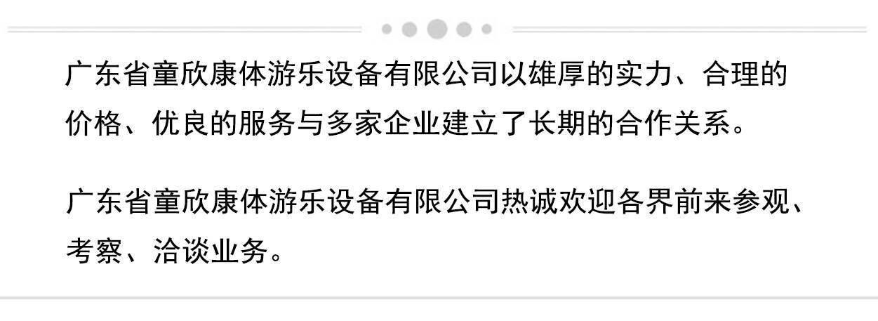 专业生产:本公司以游乐设施、幼儿园配套设施、健身器材、水上乐园为主打产品,并兼营EPDM地面施工,以及休闲设施,融设计、开发、生产、安装、销售为一体的大型综合性实业公司,拥有独立的科研、生产、销售团队,公司成立模具车间,厂区面积20000平方米,员工200余人。公司现有产品包括室外儿童游乐设施、户外健身器材、木制积木玩具、室内淘气堡、安全地垫、EPDM橡胶地垫和运动跑道、幼儿园配套设施、艺术装修、公园和小区配套休闲设施;青少年拓展训练,整体环境规划设计、施工,还可为客户“量身度造”地提供配套的设计、安装和主题活动开发等服务。