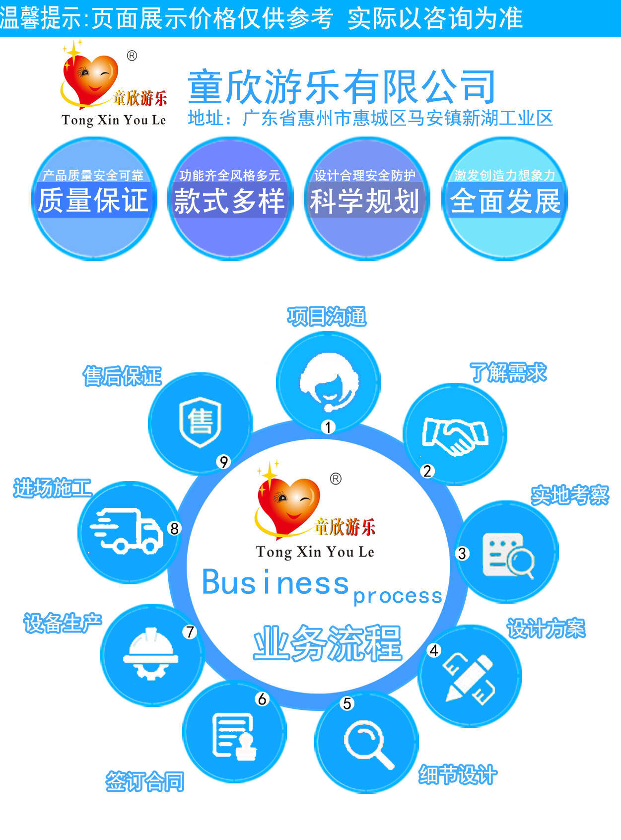"童欣"品牌产品质量通过德国TUV:EN1176欧洲标准认证、通过ISO9001质理管理体系认证,本公司自已拥有出口权,是广东省最有规模,最有好评的游乐设备制造厂。
