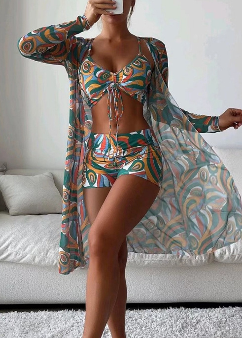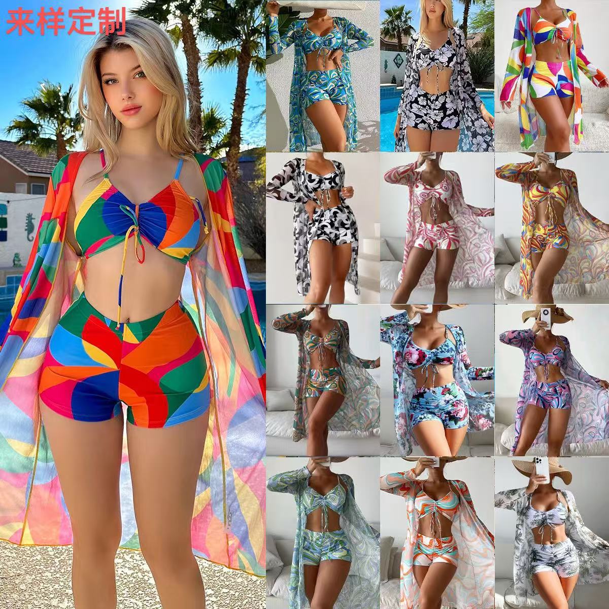 Европейский и американский внешний торговый купальник женский тройной комплект с высокой талией с длинными рукавами сетка красный костюм блузки сексуальное бикини оптом