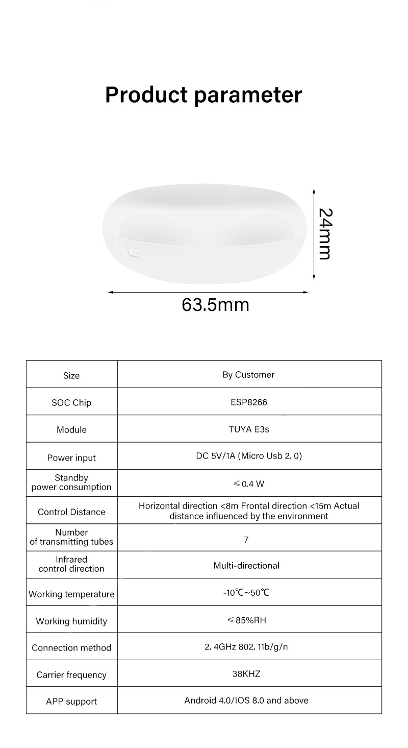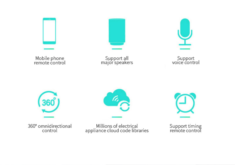 兼容Alexa/Echo、Google Home,可对电视、机顶盒、空调和风扇进行语音控制。该设备仅支持2.4G WiFi。