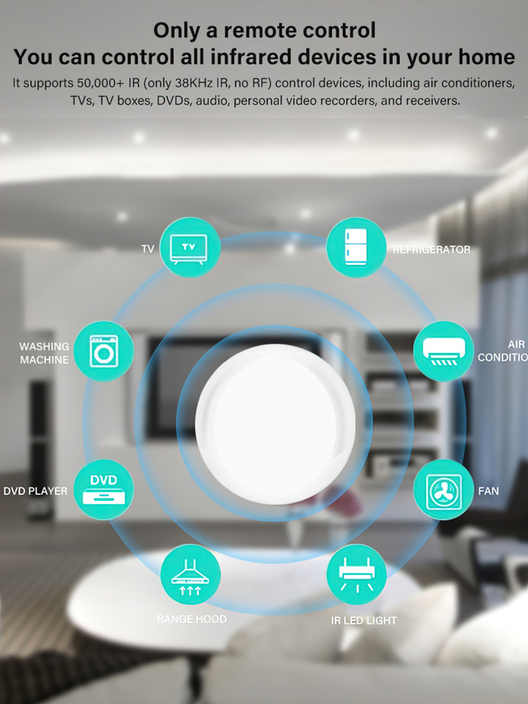 随时随地使用图雅智能应用程序或智能生活应用程序控制红外设备。将您的基本家用设备变成智能设备,让生活更智能、更方便。