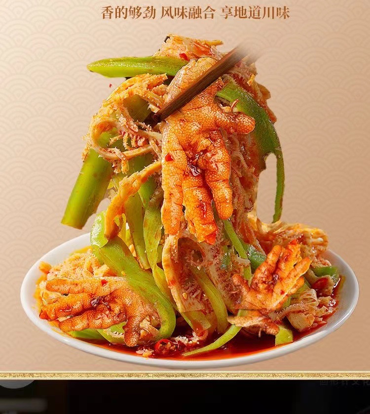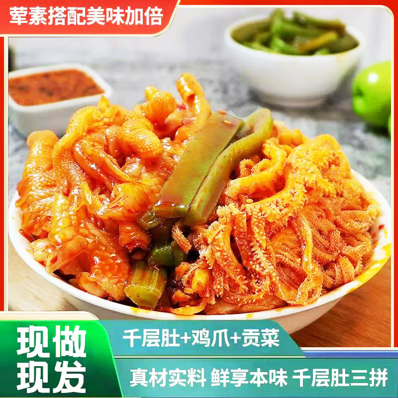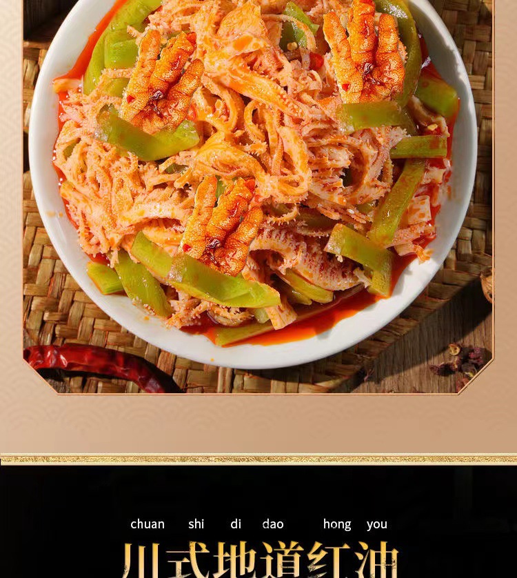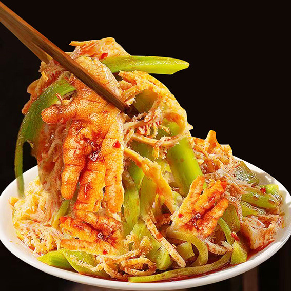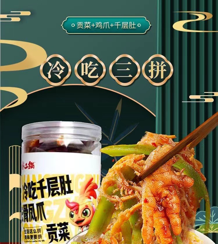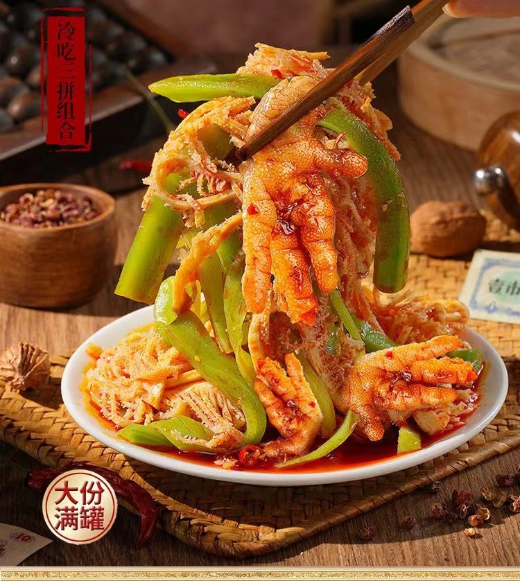 Холодная миль-фуэль, куриные лапки и гонгцай «три в одном» с пряным красным маслом Сычуань — моментальная закуска для поздних ночей.