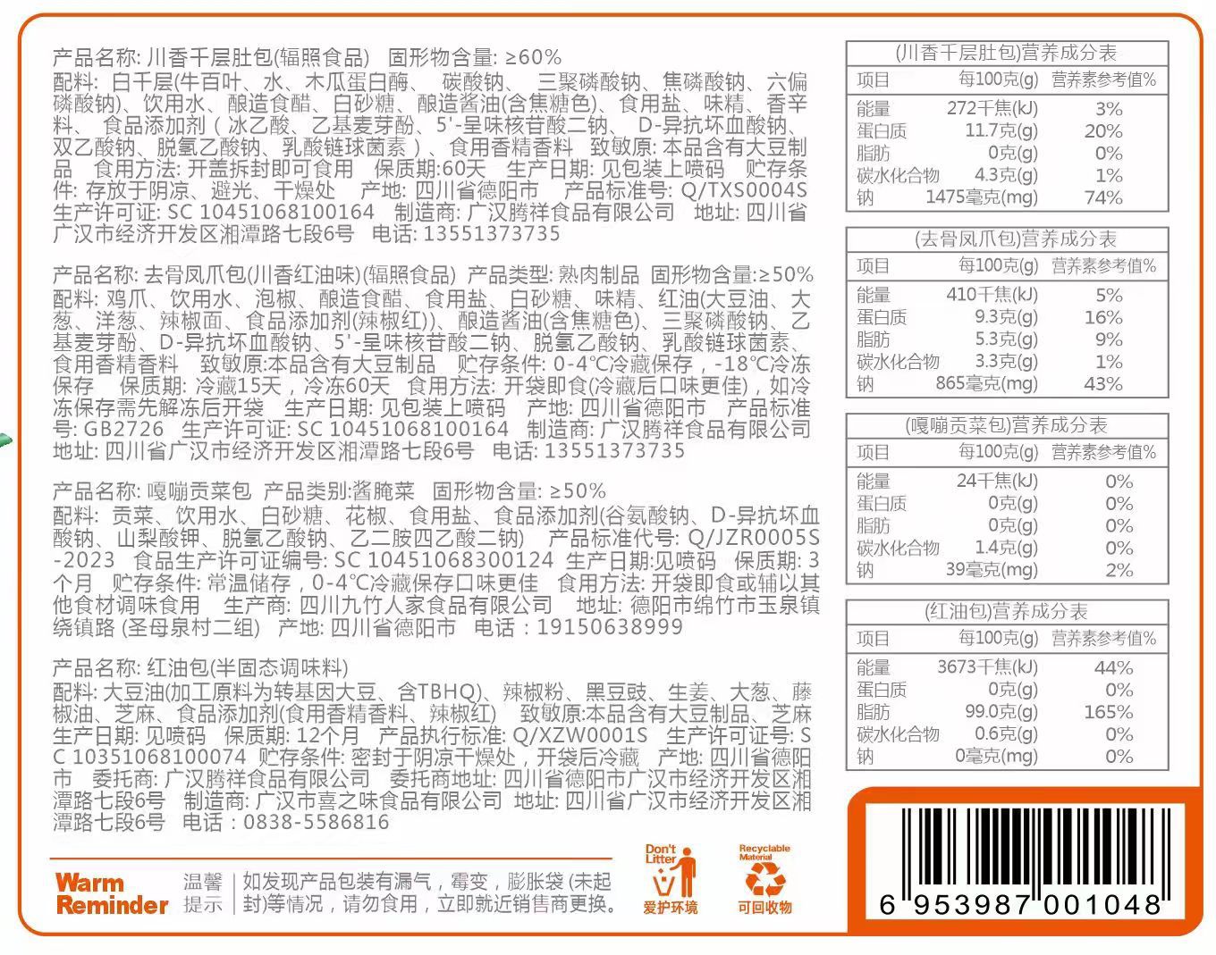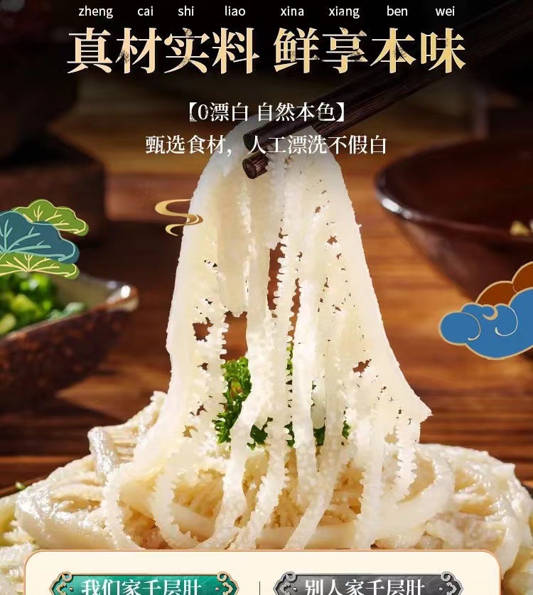 800 г, три штуки: Тысячелепковый рубец + куриные ножки без костей + овощи в качестве дань; 820 г двойной комбинации: Тысяча слоев рубец + овощи в знак благодарности; Двойная комбинация 500 г: Тысяча слоев живота + овощи в знак признательности; 280 г Тысячный слой живота