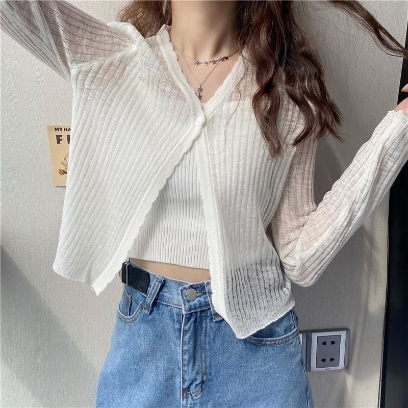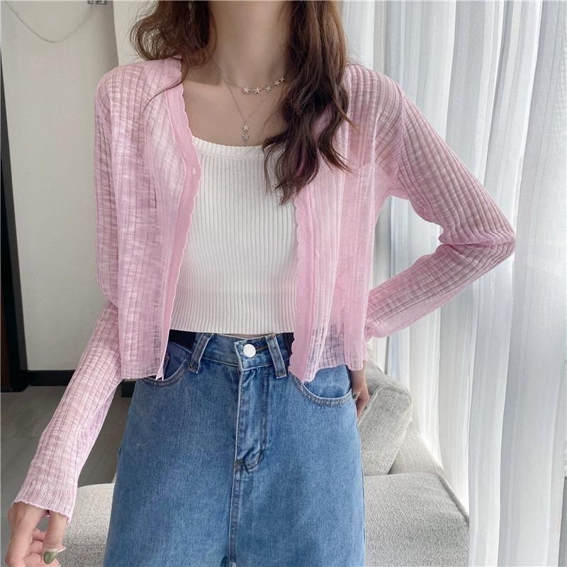 Солнцезащитный кардиган куртка женский 2023 летний новый тонкий внешний свободный длинный рукав трикотажный короткий топ ins прилив