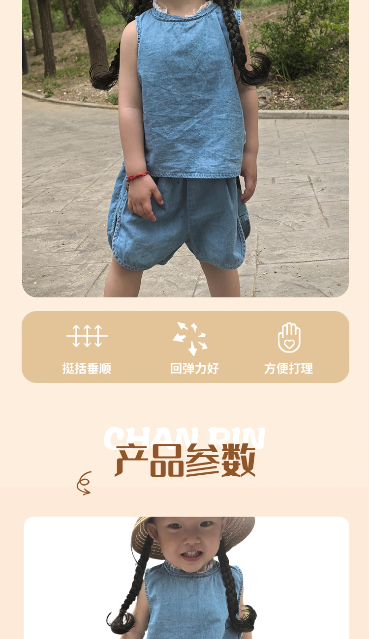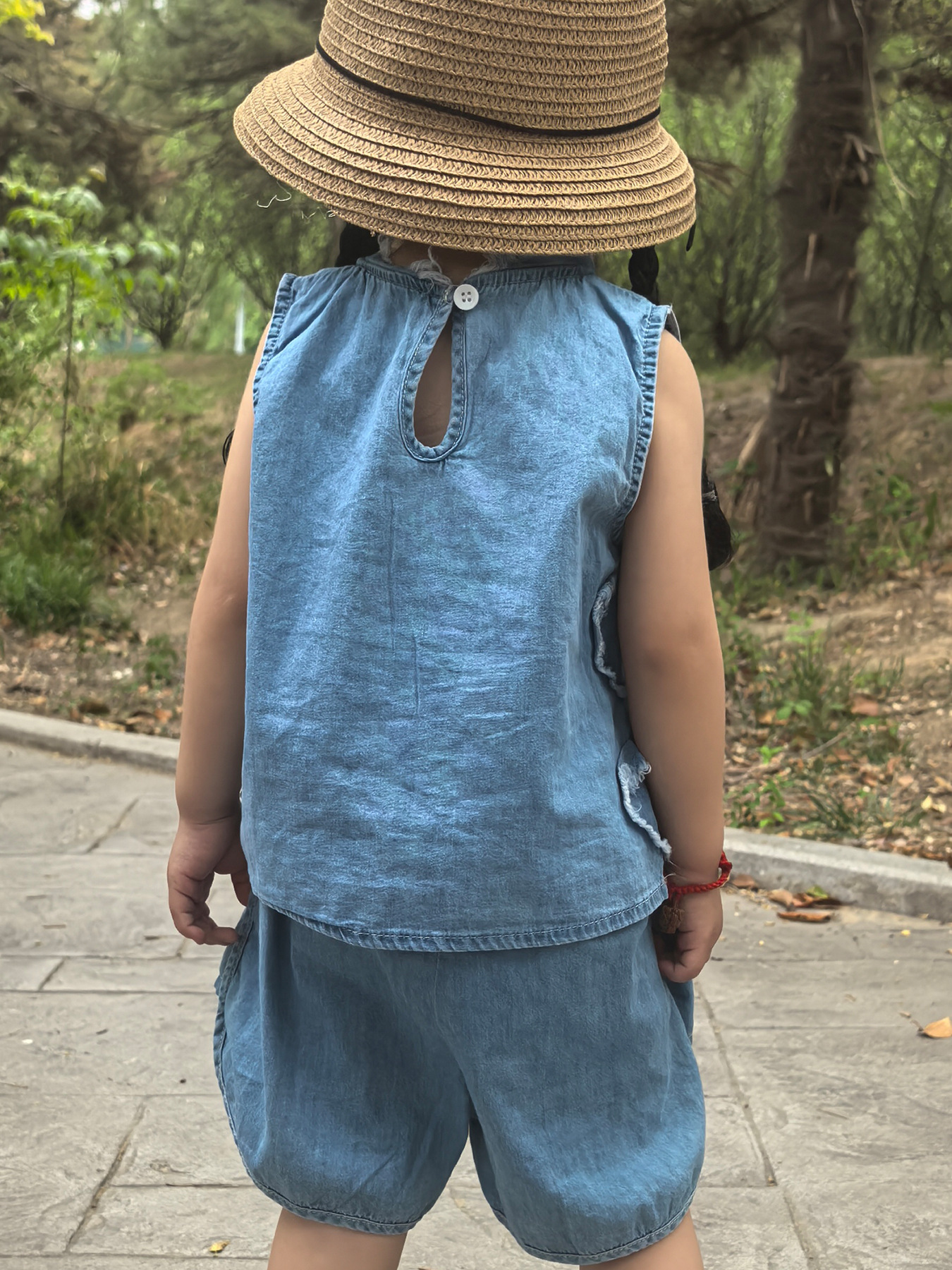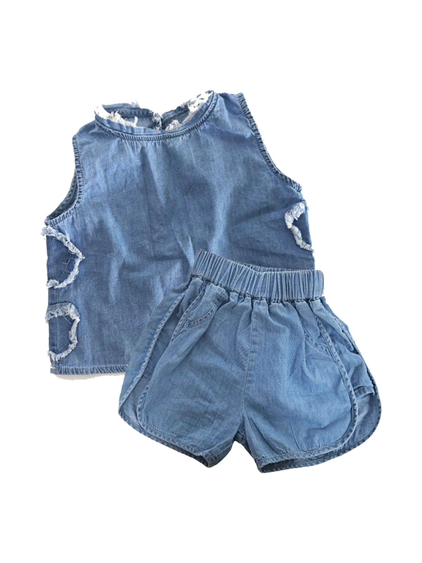 Летний стильный комплект из искусственного денима для девочек 2025, новый корейский стиль, тонкие шорты, двухкомпонентный набор для малышек