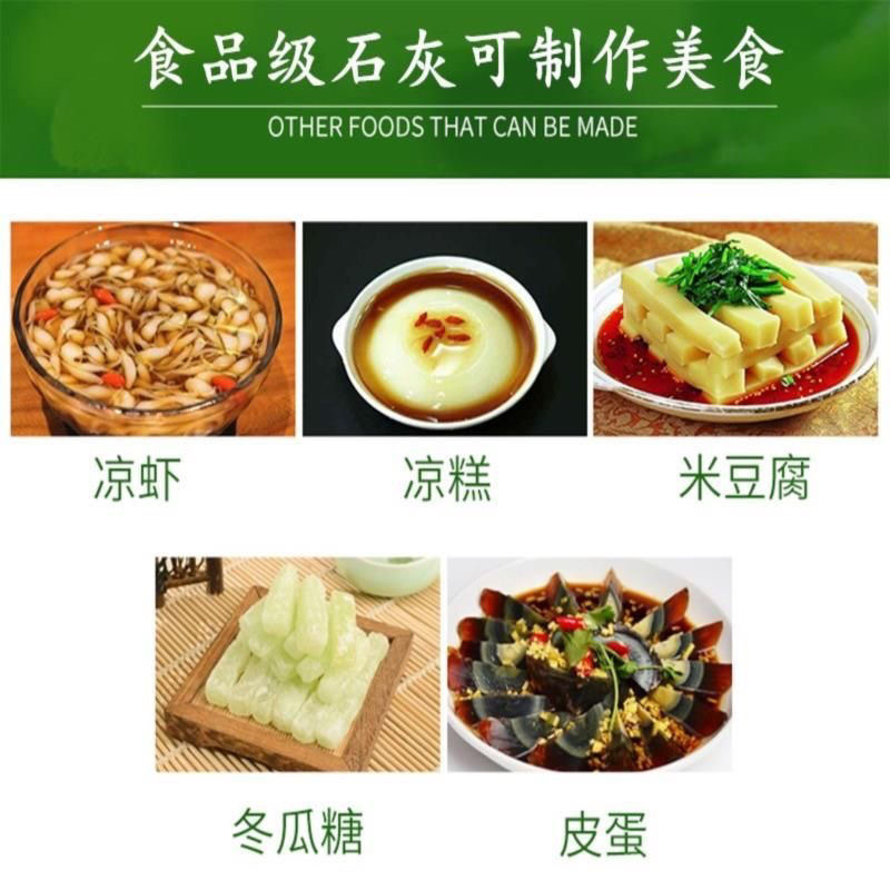 Используйте порошкообразный гашёный кальций для приготовления ледяного желе, рисового тофу, пищевого желе, желе-кексов, желе из креветок, яичного желе, гидроксида кальция, пищевого качества.
