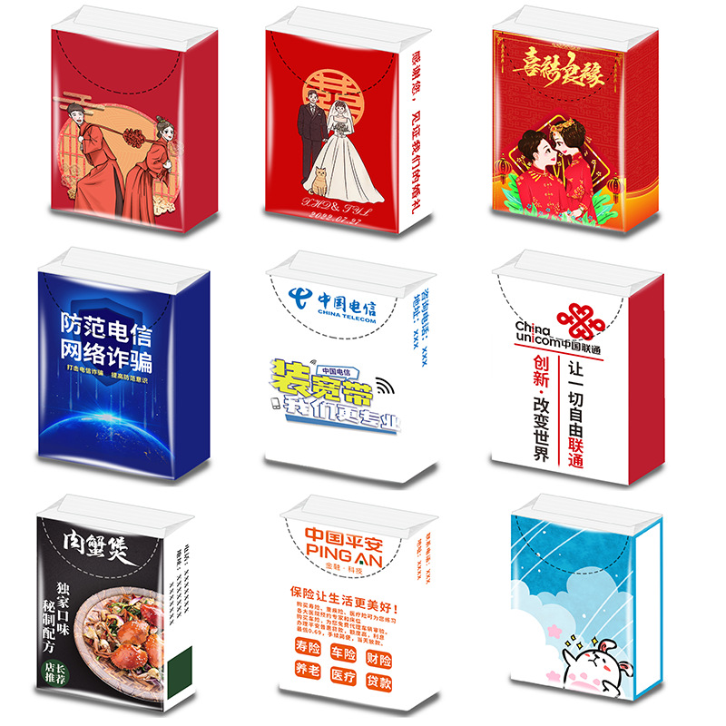 Индивидуальные маленькие упаковки из тонкой бумаги, бумажных платочков, салфеток с печатью, лицевых салфеток, гигиенической бумаги для общепита, с возможностью нанесения логотипа.
