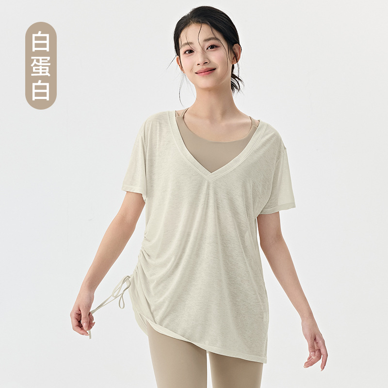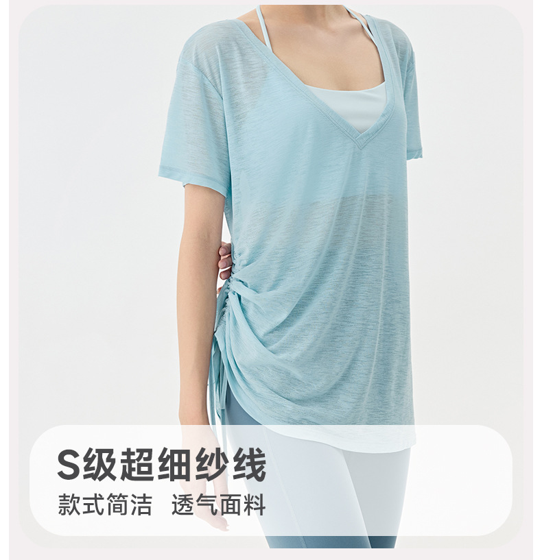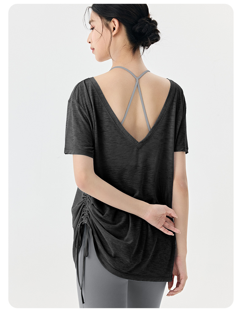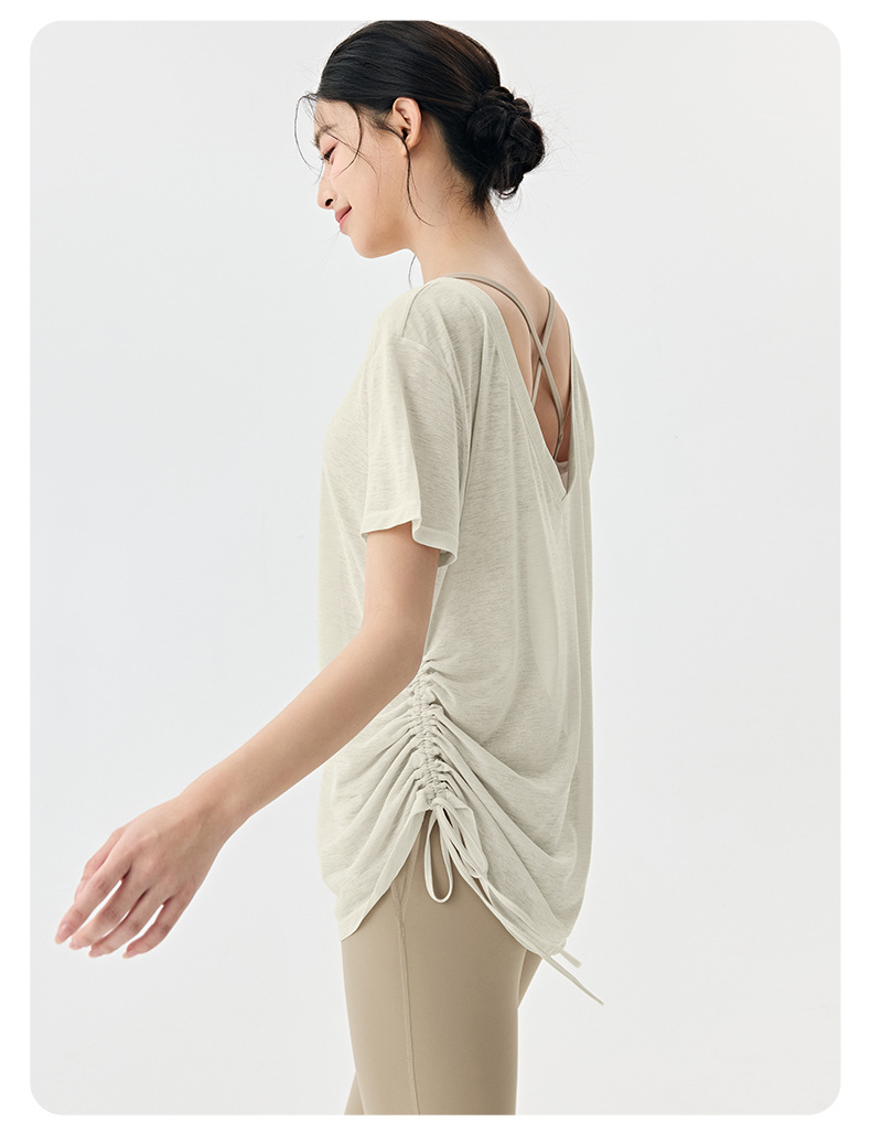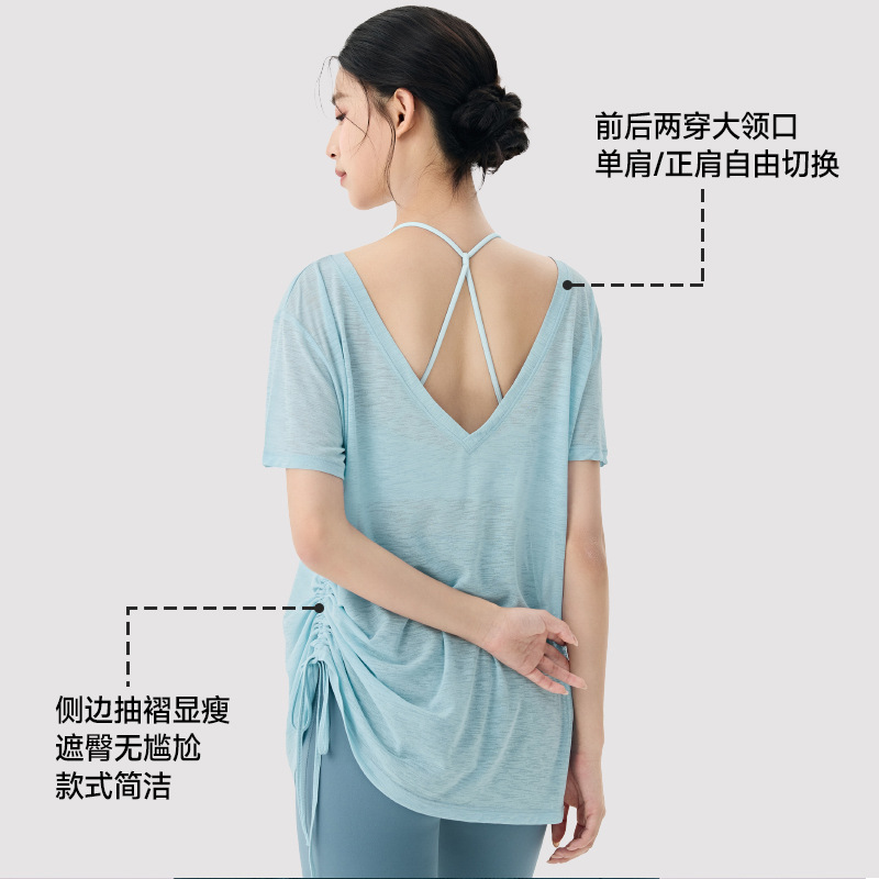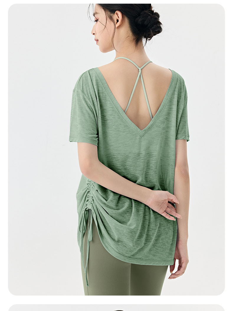 Летняя спортивная блузка с присборенной боковой частью для женщин, закрывающая ягодицы, свободная повседневная футболка для йоги, большой вырез, тонкая одежда для фитнеса.
