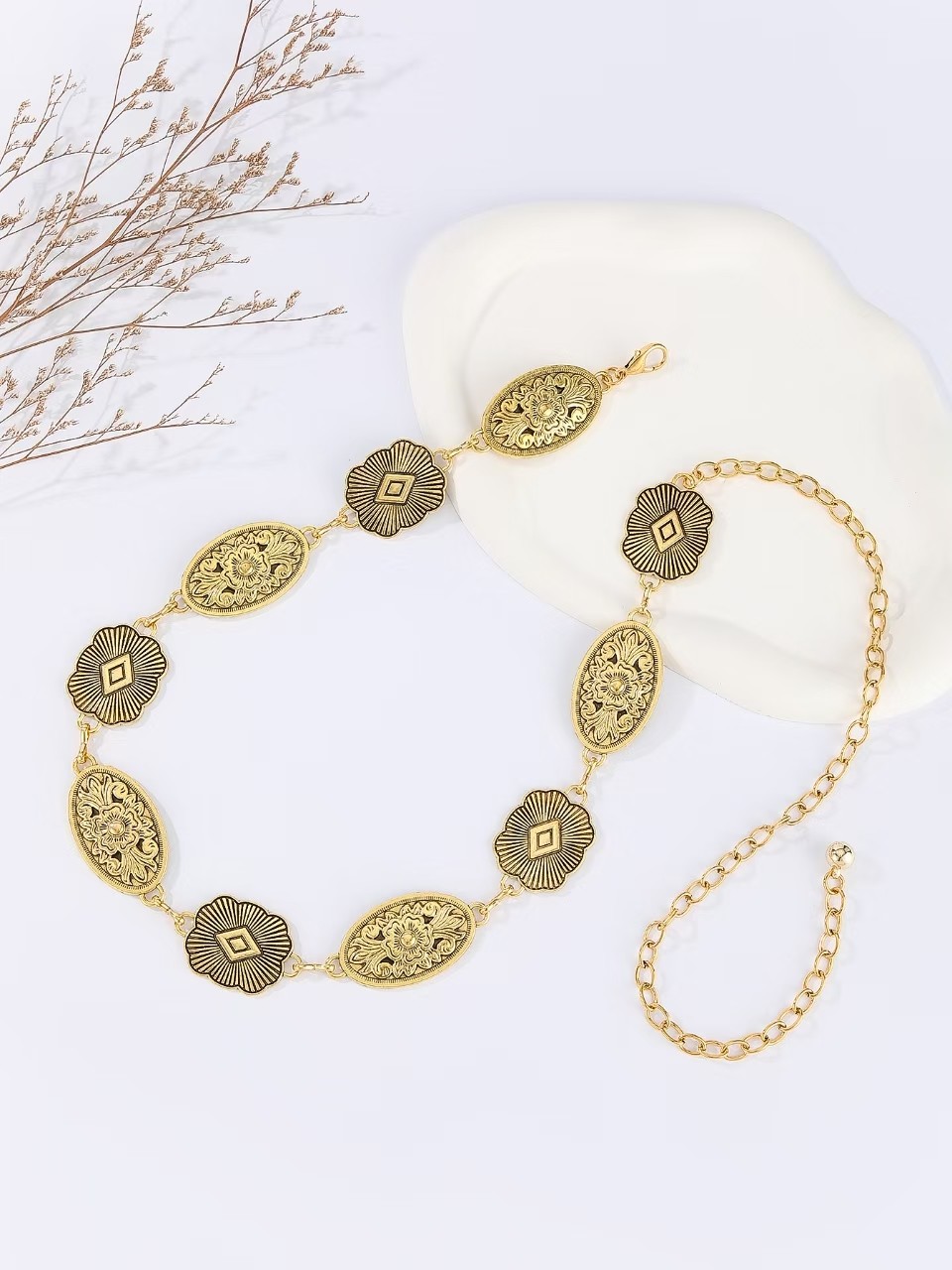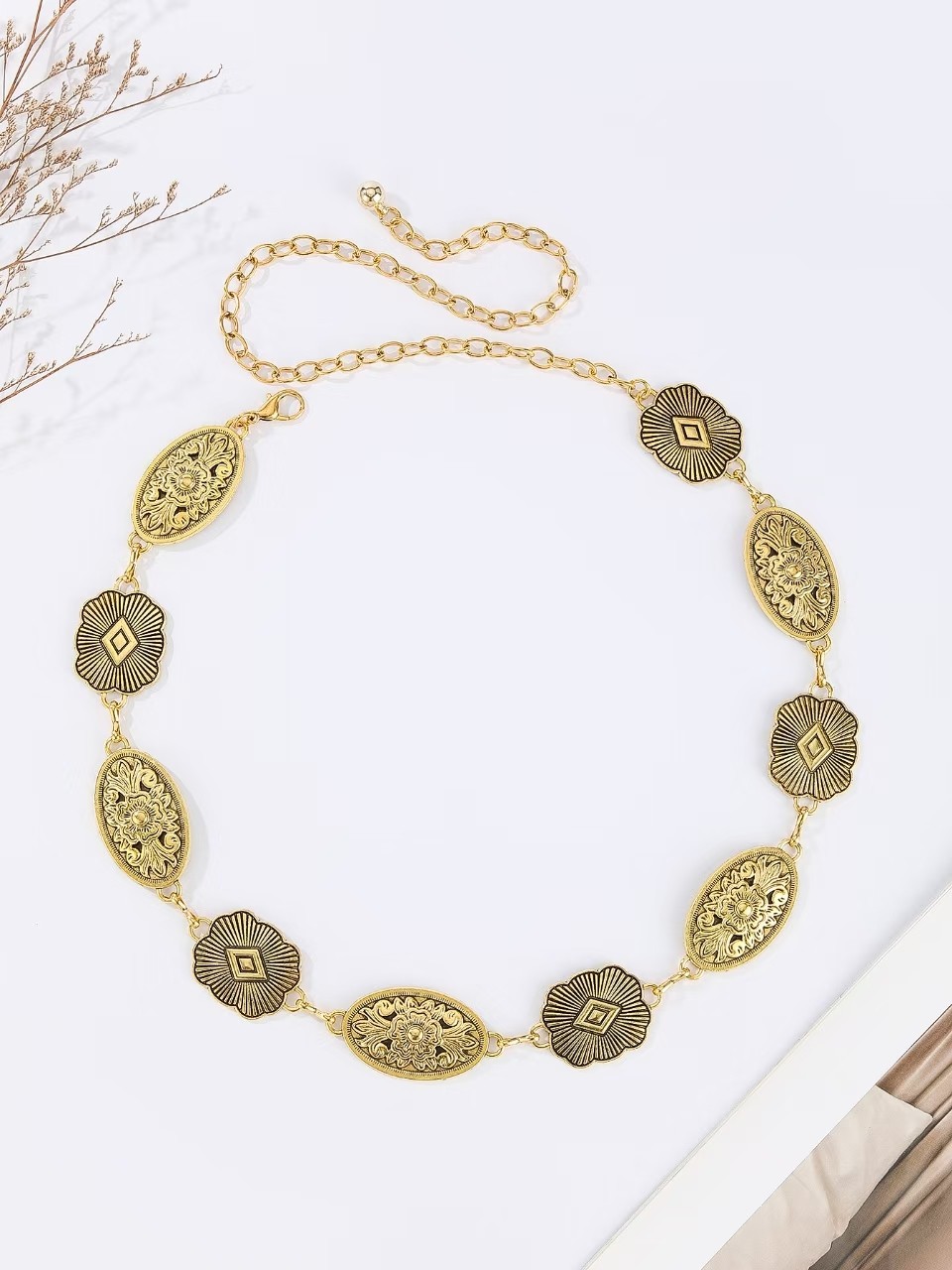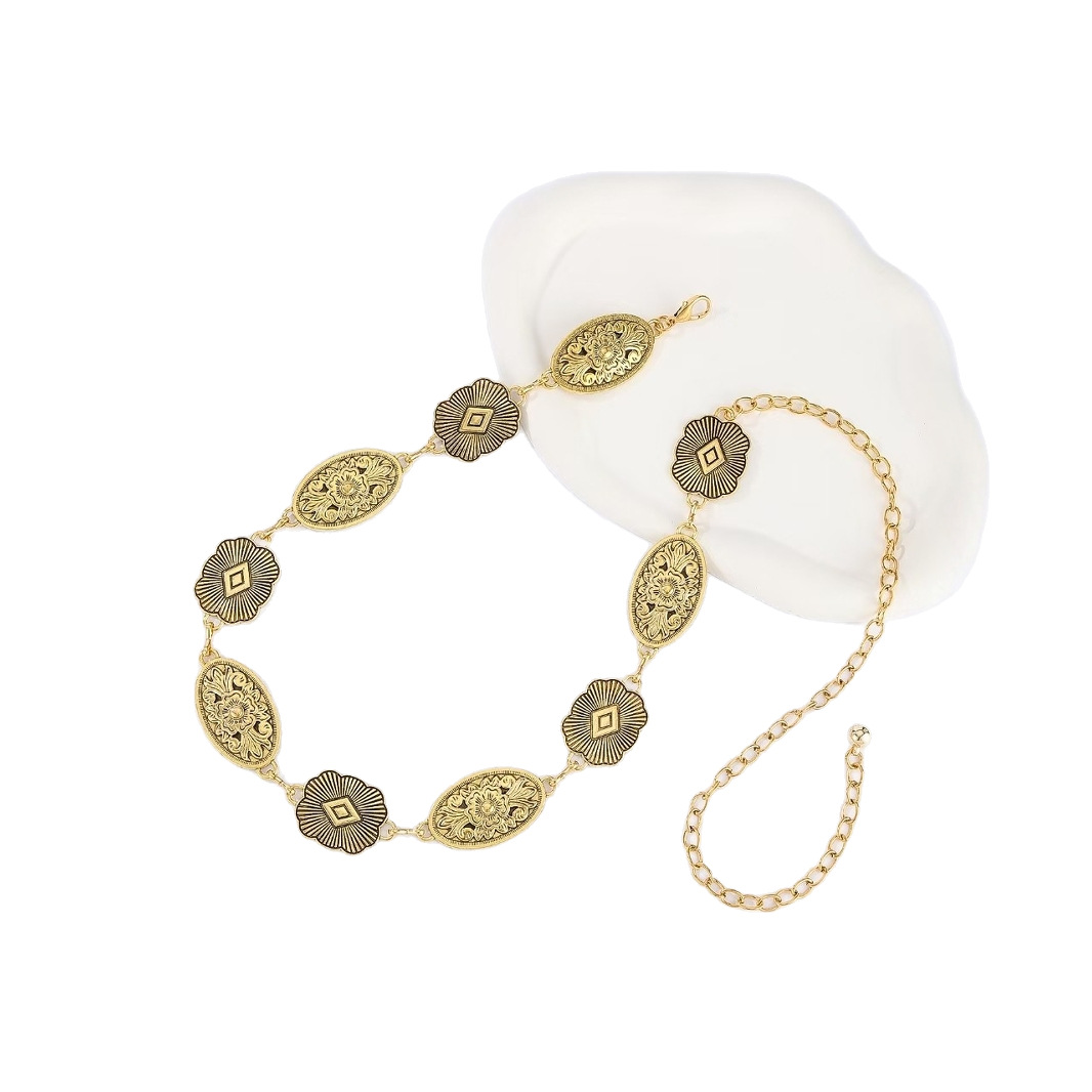 Золотая поясная цепочка [подвеска-цветок; Серебряная поясная цепочка [подвеска-цветок; Золотая поясная цепочка [овальная подвеска; Серебряная поясная цепочка [овальная подвеска
