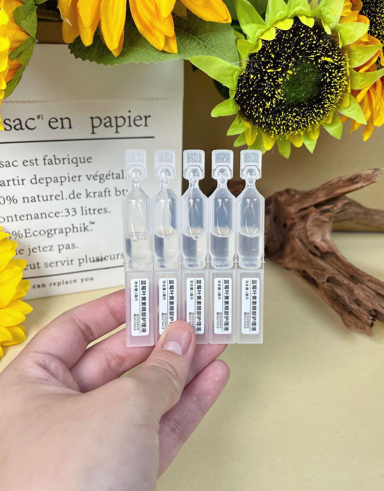 Один флакон одноразового раствора для ухода за глазами.