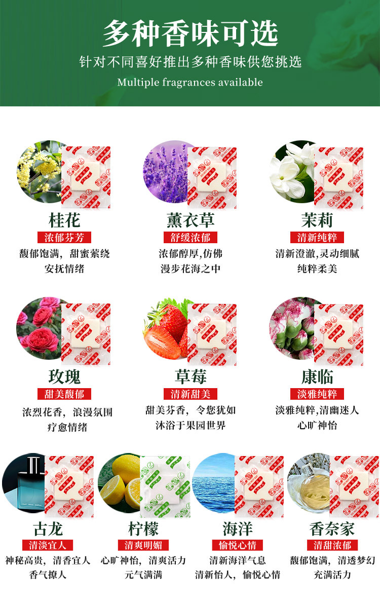 Кельн (пожалуйста, возьмите целое кратное 500); Молоко (пожалуйста, возьмите целое кратное 500); Роза (пожалуйста, возьмите целое число, кратное 500); Клубника (пожалуйста, возьмите целое кратное 500); Лаванда (пожалуйста, возьмите целое число, кратное 500); Османтус (пожалуйста, возьмите целое кратное 500); Цветок магнолии (пожалуйста, сделайте фотографию в целых кратных 500); Цяньлисянь (пожалуйста, возьмите целое число, кратное 500); Ваниль (пожалуйста, возьмите целое кратное 500); Chanel (пожалуйста, делайте фотографии в целых кратных 500); Жасмин (пожалуйста, возьмите целое число, кратное 500); Лимон (пожалуйста, возьмите целое число, кратное 500)